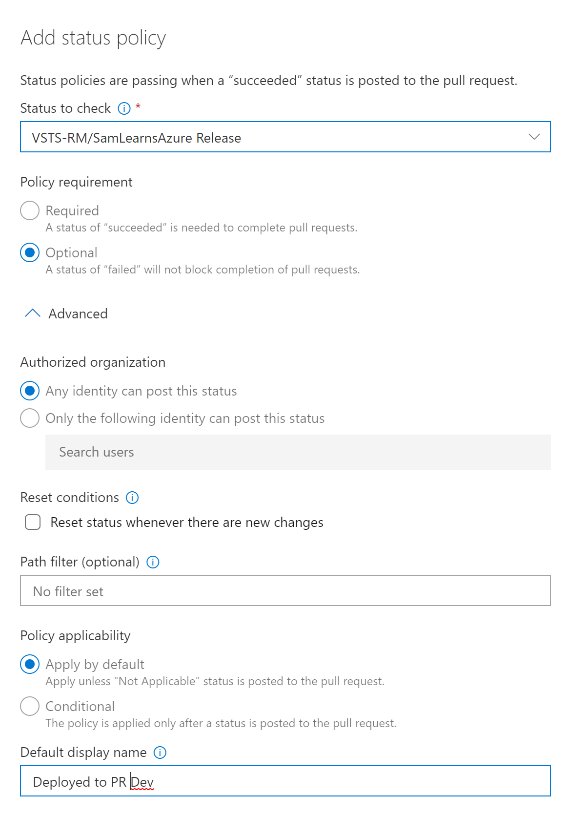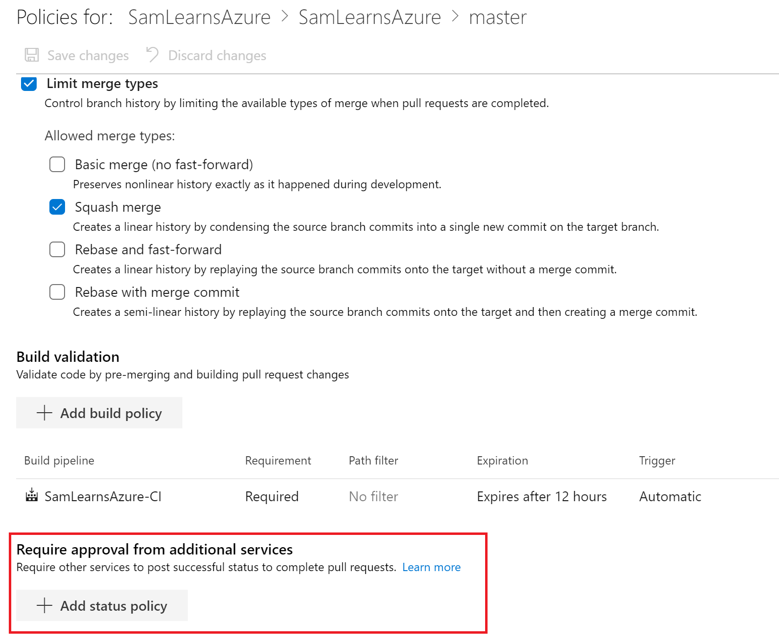 Next on the branch policies, we use the “Require approval from additional services” section to add a new “status policy”