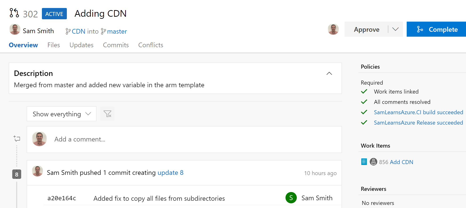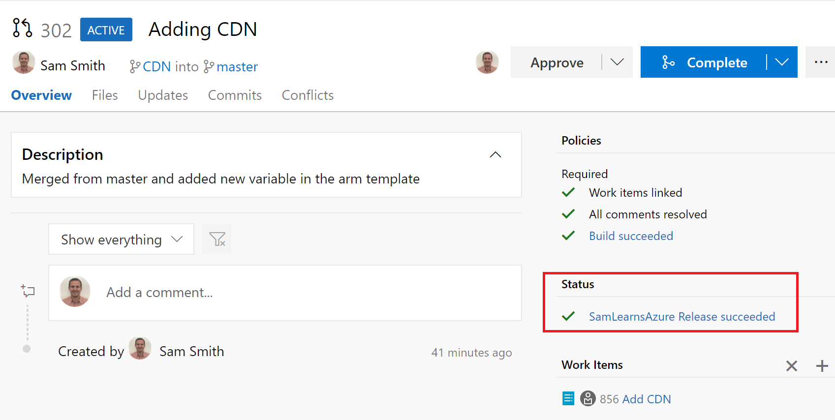 Now we can see our completed pull request, with all of the policies complete. Note that at this stage, we have made the successful deployment a requirement. Our pull requests are now testing an end to end build and deployment!