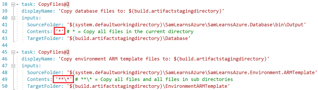 More to come for this later… but for now, we resolve this we are going back to one build. You may remember that we split the ARM template into a separate build, but practically, we are all deploying in one release. We add a new copy files task to copy the template to a new folder in our build YAML. It’s worth noting the “Contents” property of the copy task and the different ways we can copy just files, or files AND all sub-directories, highlighted in red below.
