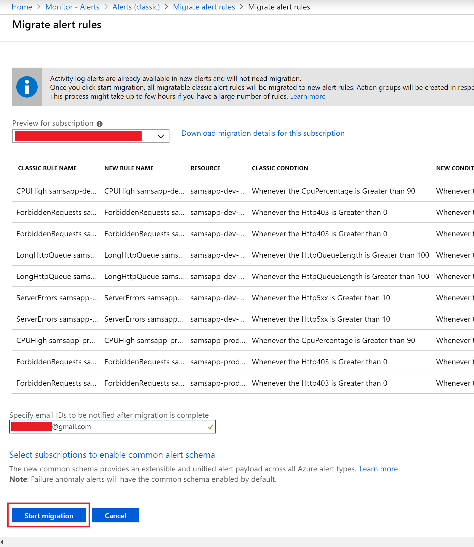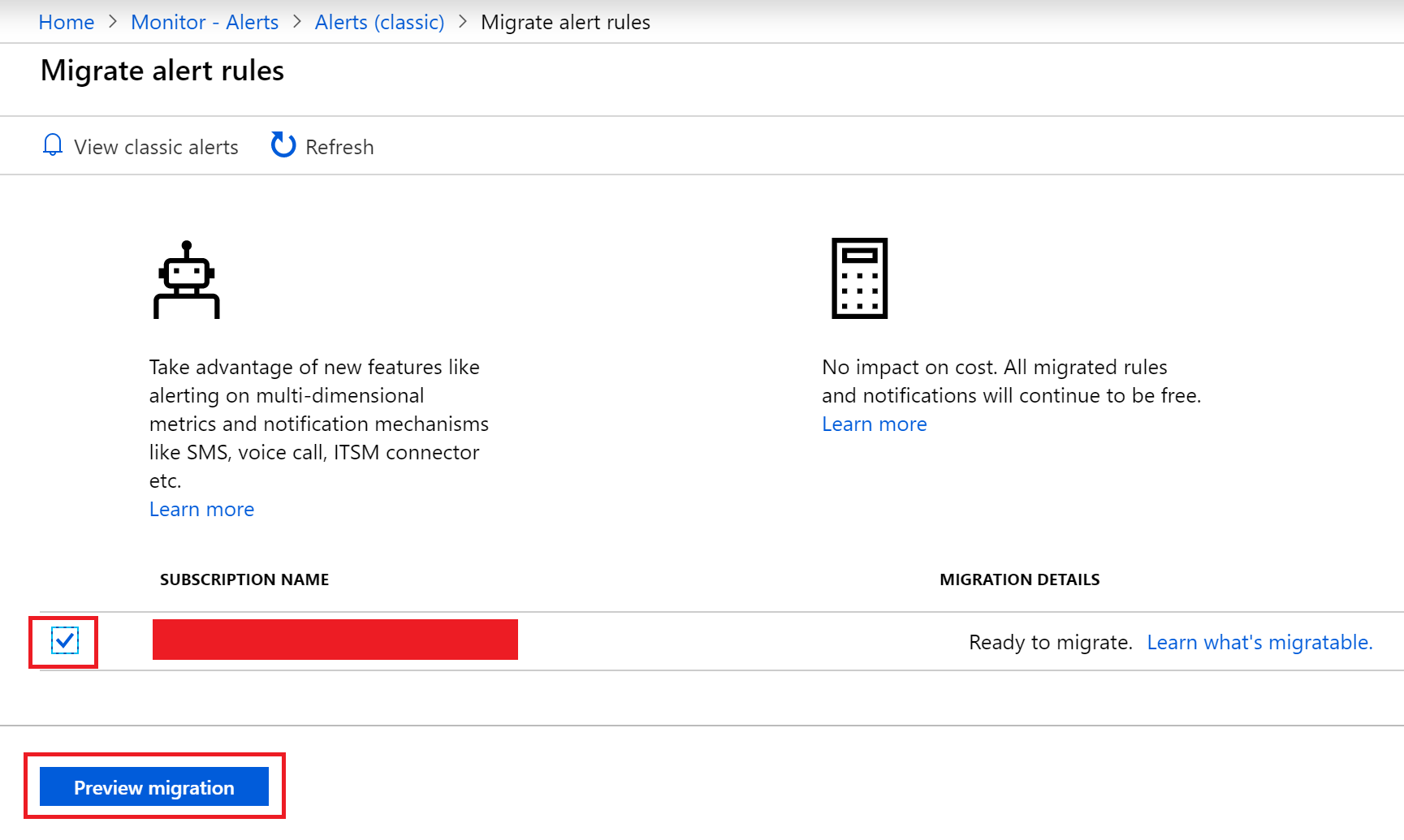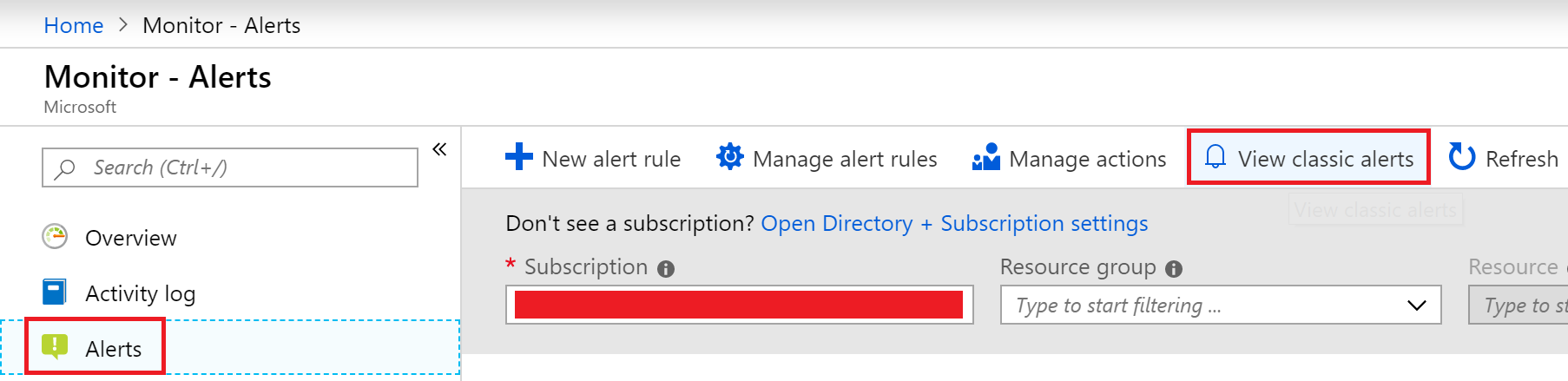 Fortunately, there is a migration process we can run. Note that once we run this on a subscription, the subscription cannot host “classic alerts” again. In our Azure Portal, we open “Monitor”, and then click on the alerts, and “View classic alerts”