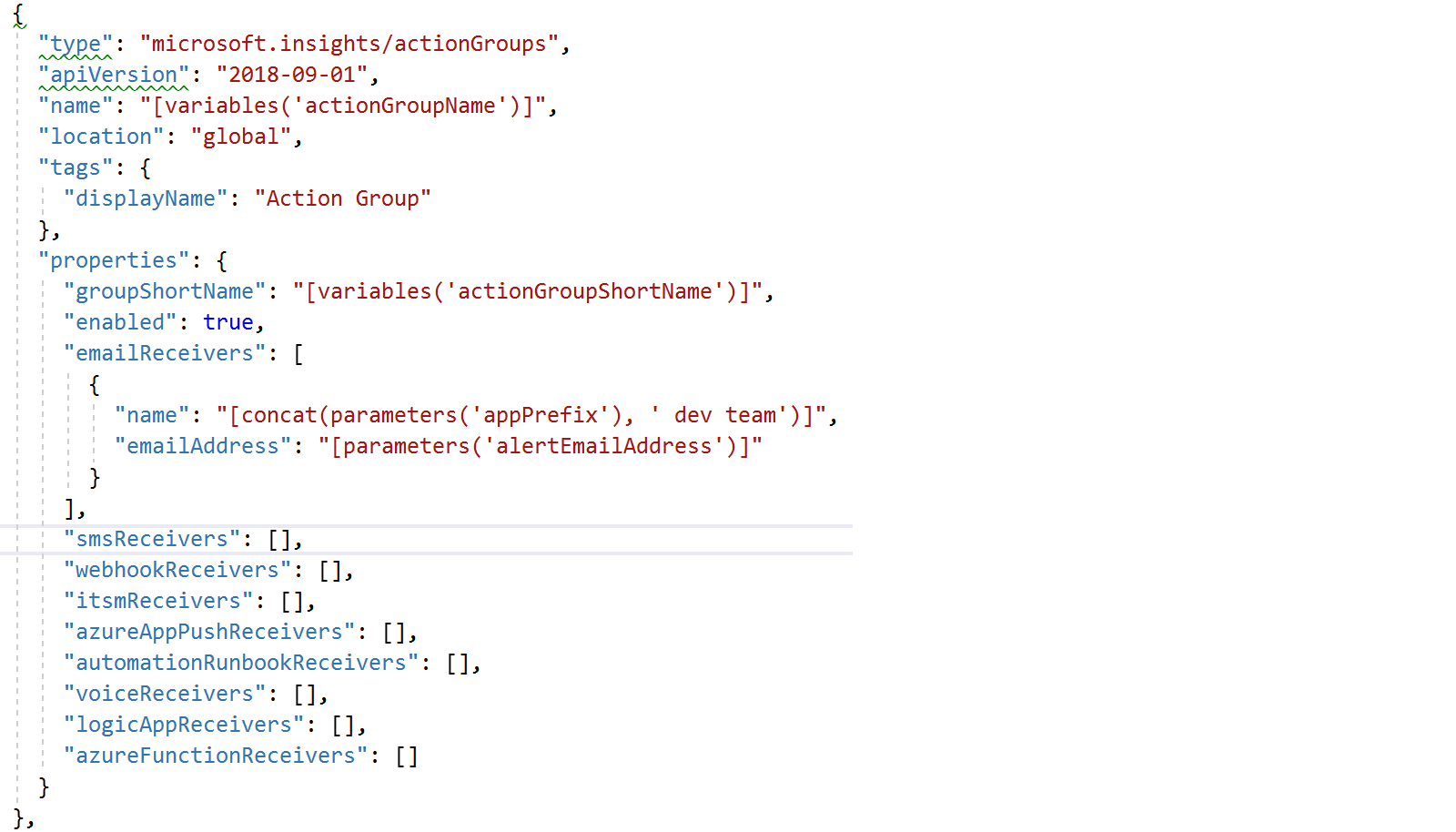 Action groups are configured in Azure Monitor and are used to notify users that an alert has been triggered . We are creating a single action group (per environment), targeted at an email address we are defining in the parameters. Our action group looks like this: