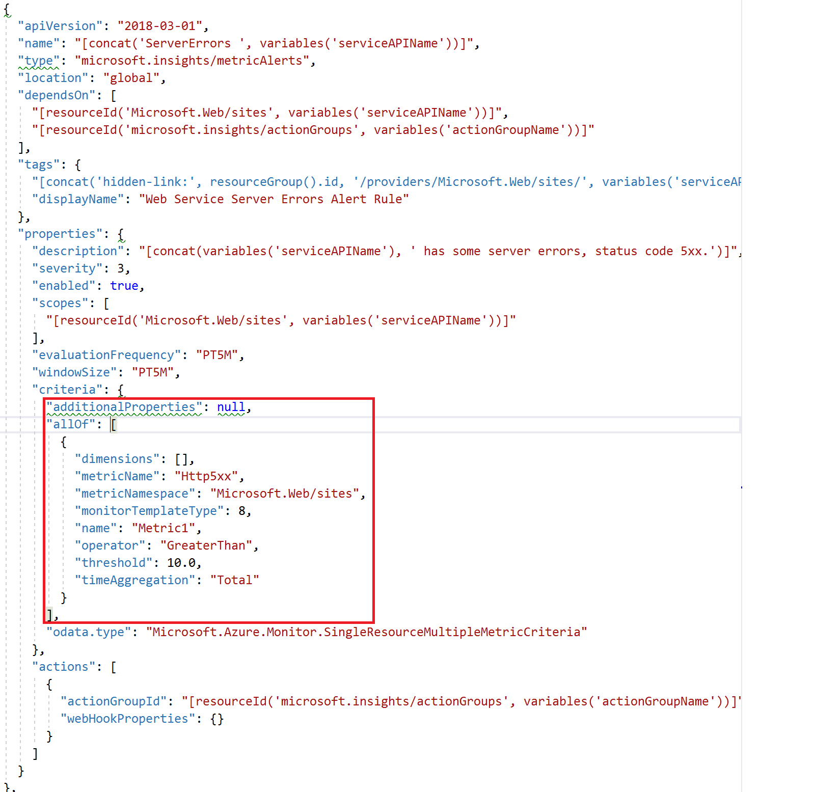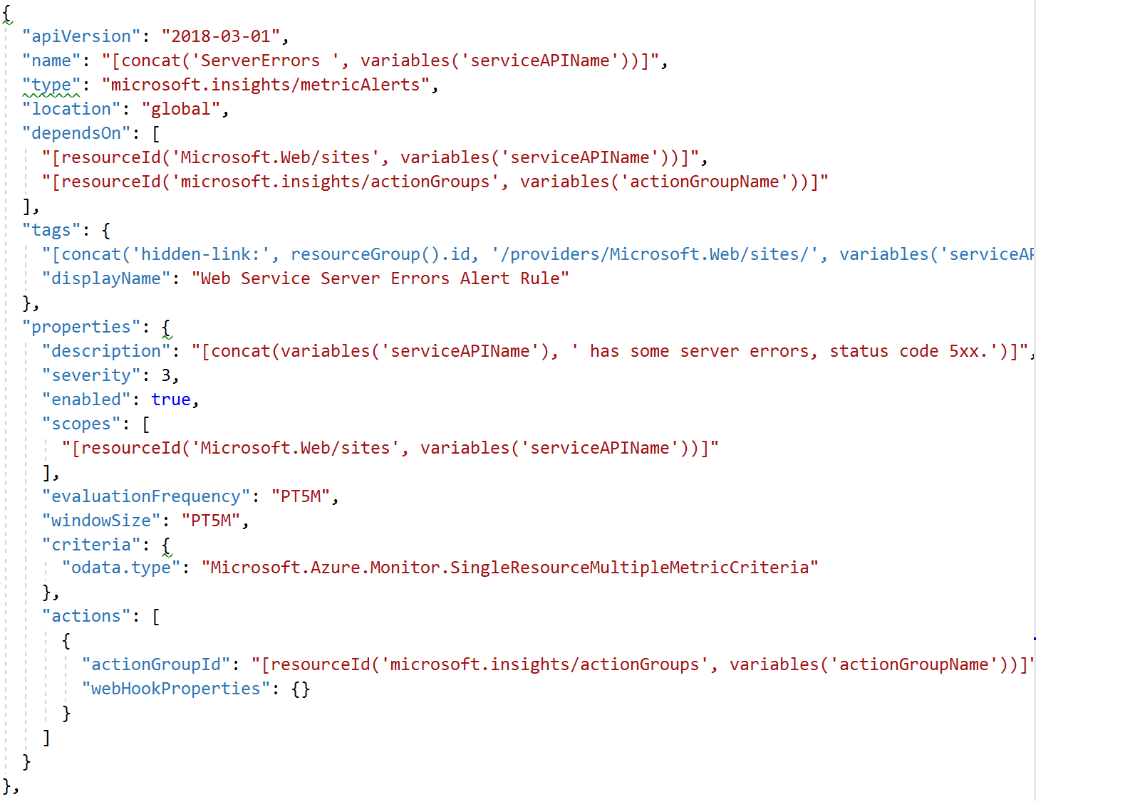 Next we need to create the new alerts, using the type “Microsoft.Insights/metricalerts”. We start by exporting the ARM templates from the portal from our upgraded/migrated alerts, and then integrating this new code into our ARM templates. Here is an example of the “server error” alert, which triggers if more than 10 HTTP 5xx errors are triggered within 5 minutes. Can you spot the missing piece that makes this broken? It stumped us for 4 days…