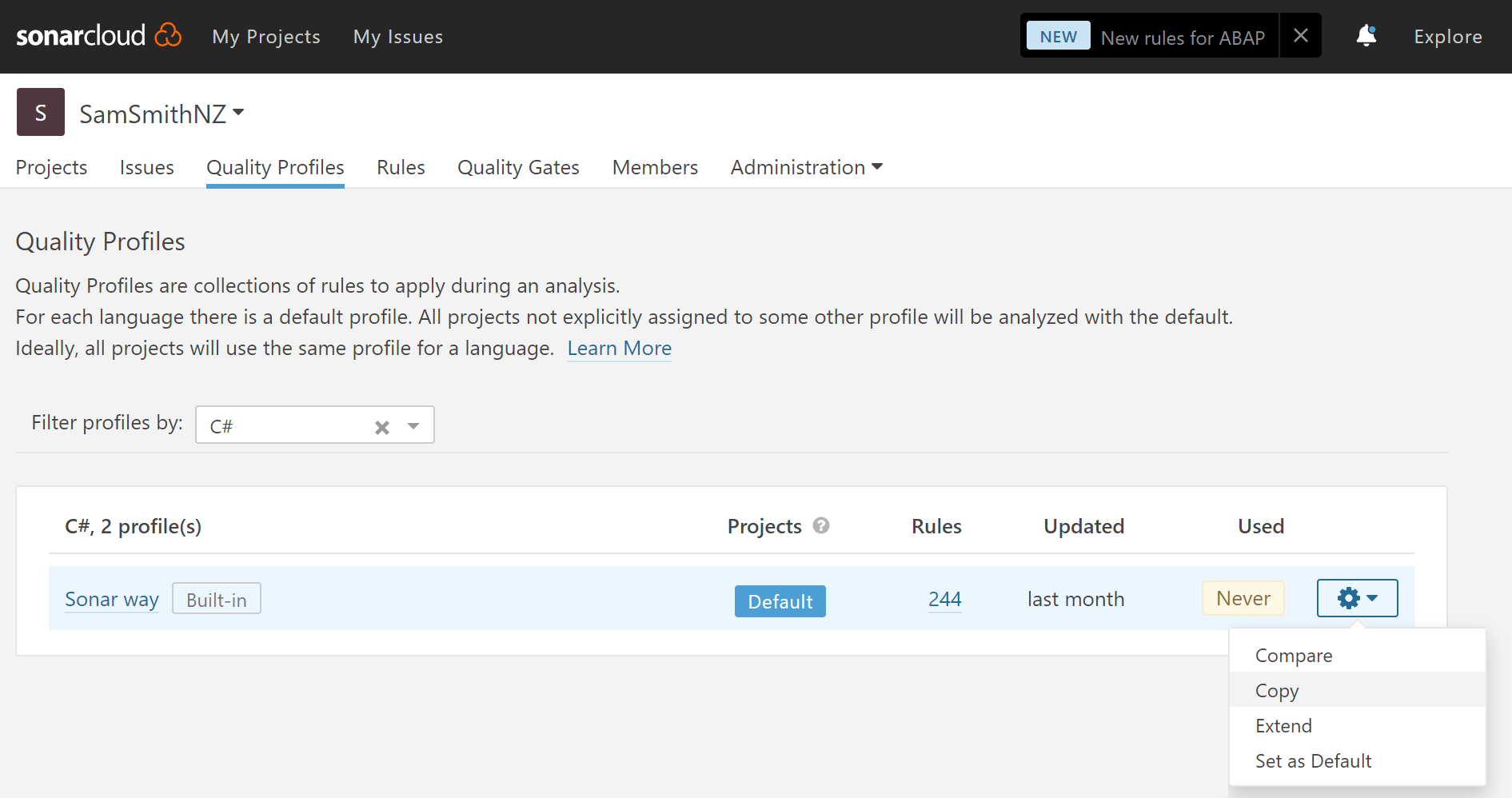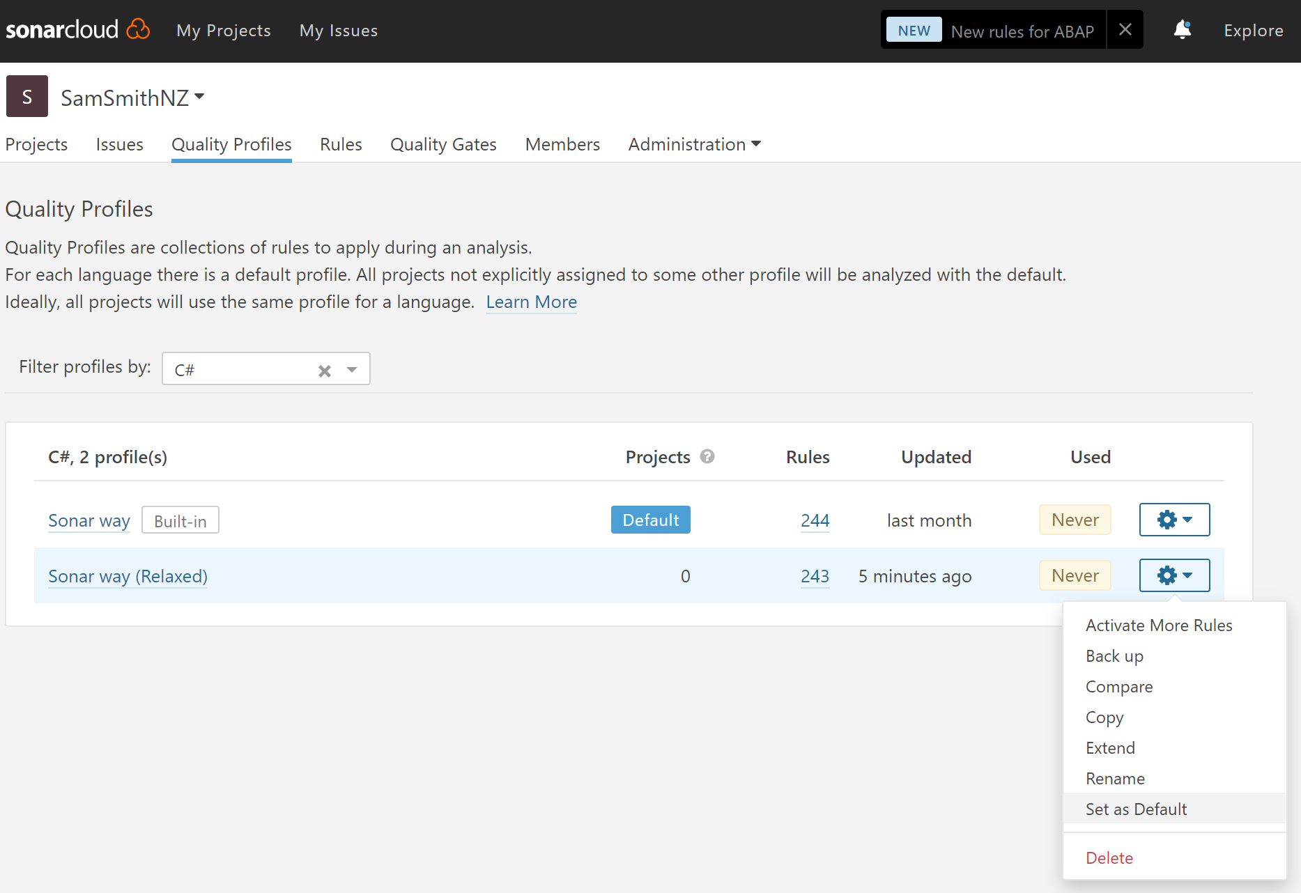 Do achieve this, in our SonarCloud instance, we browse to the “quality profiles”, and observe the current profile, “Sonar way”, which is not editable. To edit, we need to copy the existing profile and name a new profile, “Sonar way (Relaxed)”.