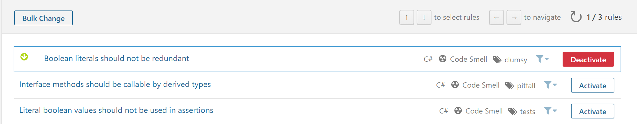 We then browse to the rules, find the one we don’t like, in this case, “Boolean literals should not be redundant”, and deactivate it.