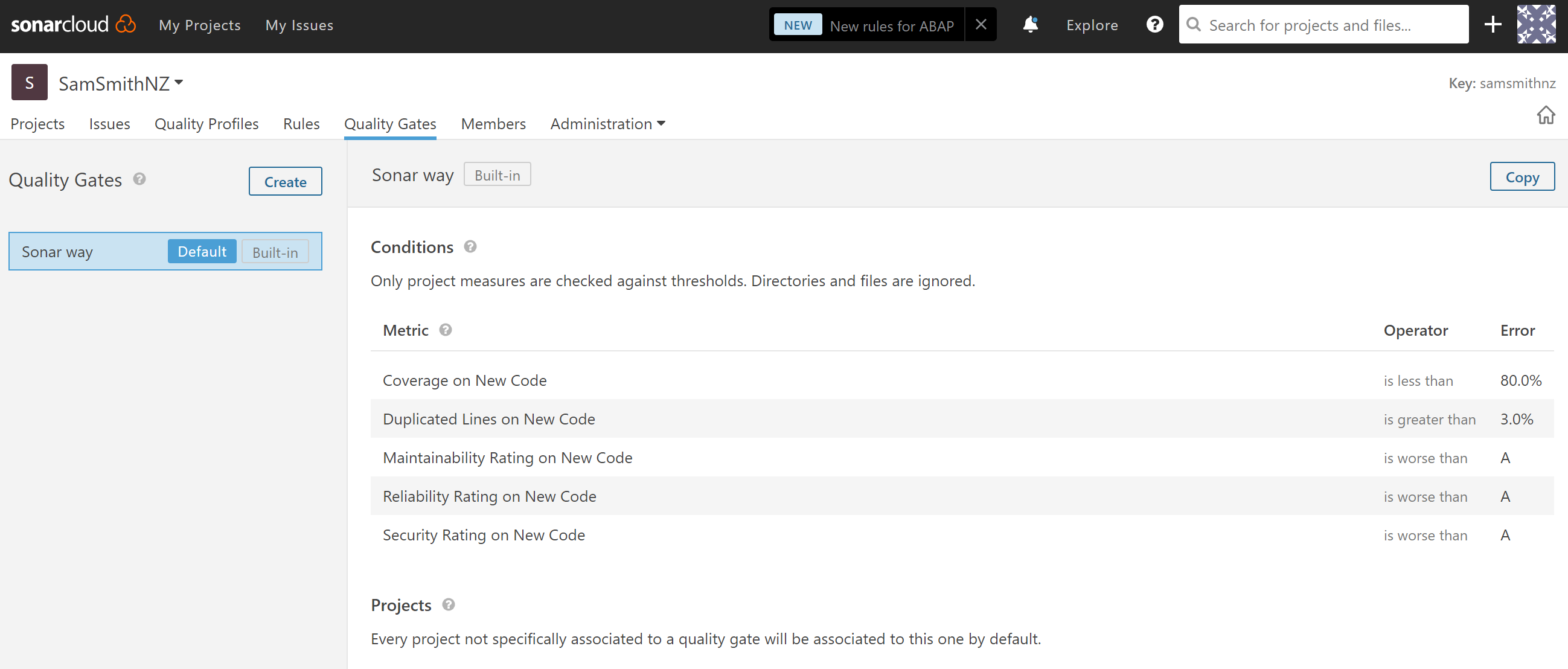 We are also having some trouble with code coverage. The current rule demands at least 80% code coverage on new code. We’ve found we regularly fails quality gates. We are happy with our overall code coverage (it’s ~90%), so we are going to change the rule to focus on overall code coverage instead of “new code” code coverage. In the account quality gates section, (not the projects quality gate section), select the “Sonar way” quality gate and copy it.