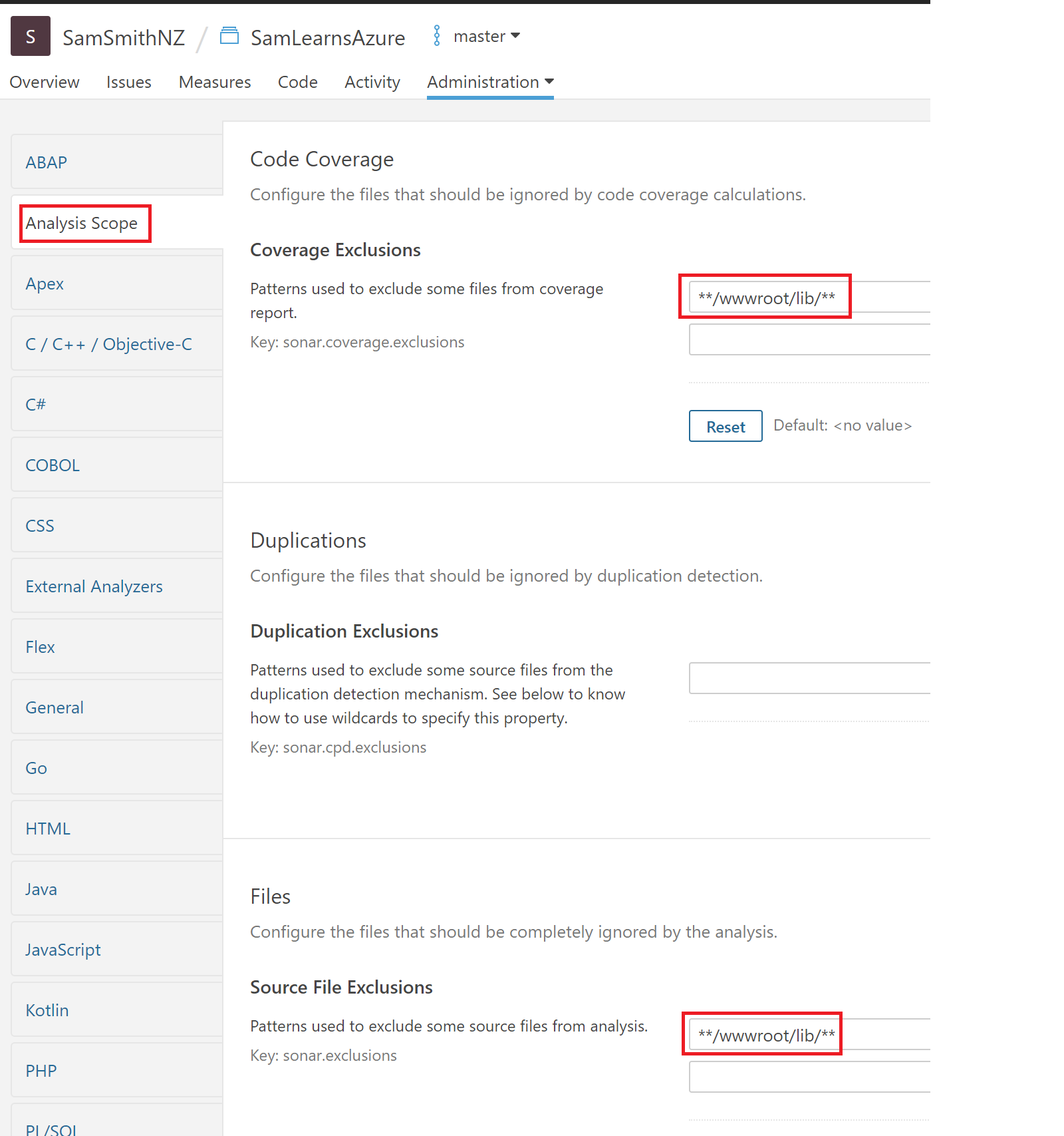 We are also generating a number of false positive hits on code we didn’t write. Finally, in “Administration”, “General settings”, we specify a few folders to ignore from code coverage, such as the bootstrap and JavaScript library folder, “/wwwroot/lib/“. We didn’t write these libraries, we aren’t planning to edit them, and as such, it is not fair that they are creating false positive bugs.