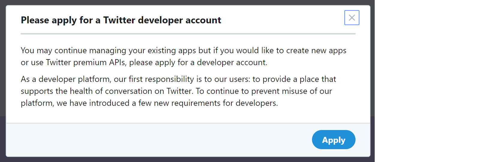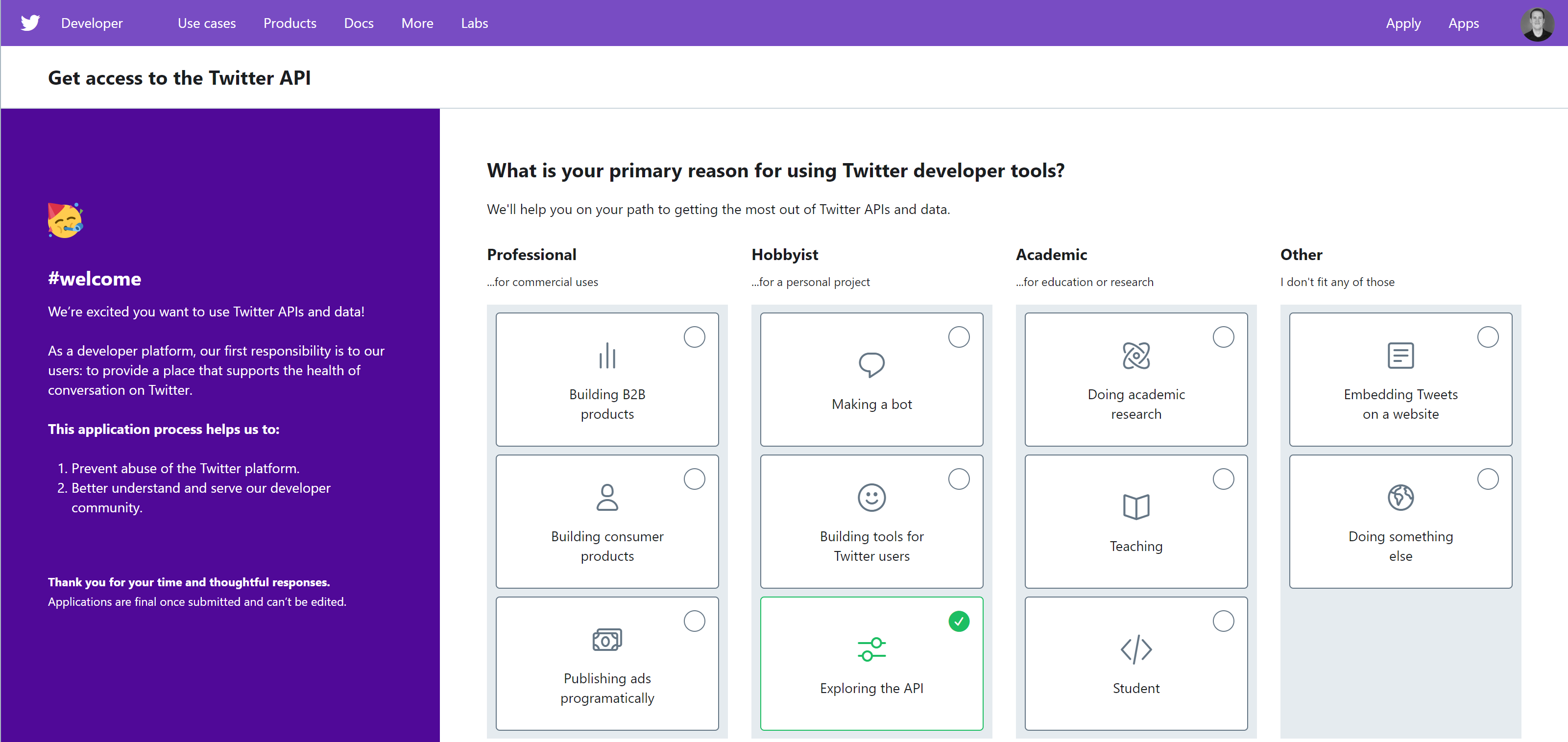 After acknowledging Twitter’s rules, we create a Twitter developer account.