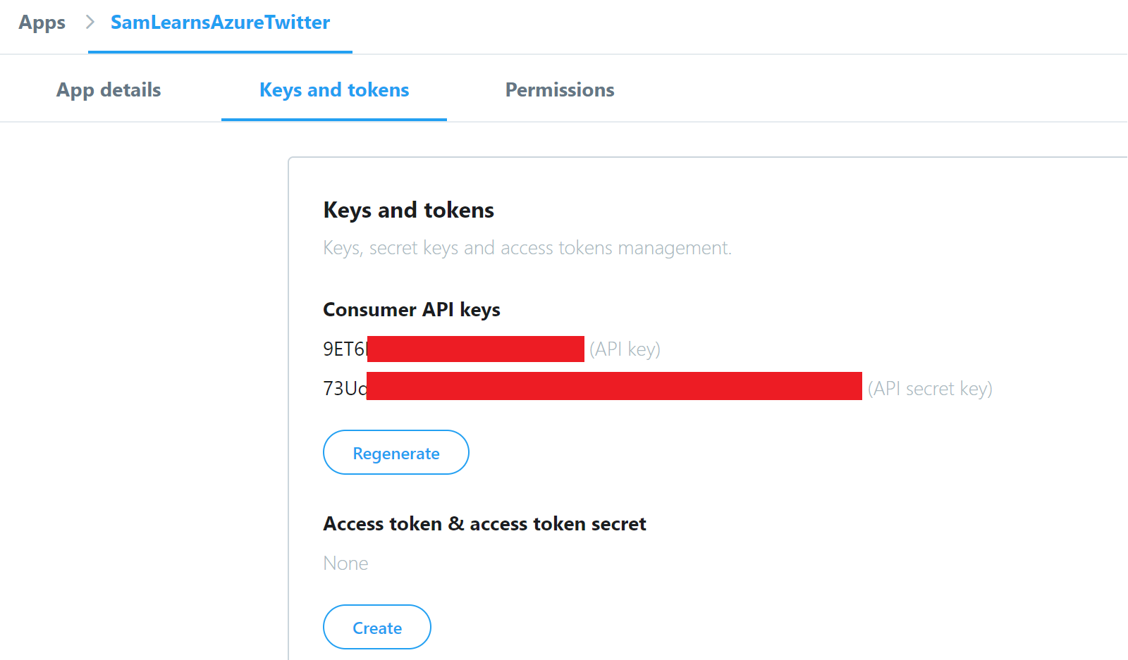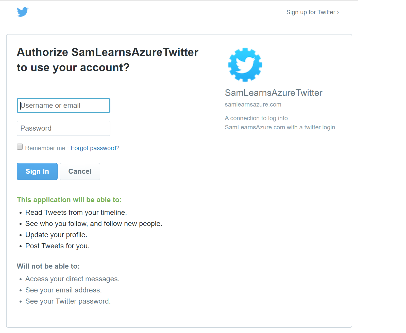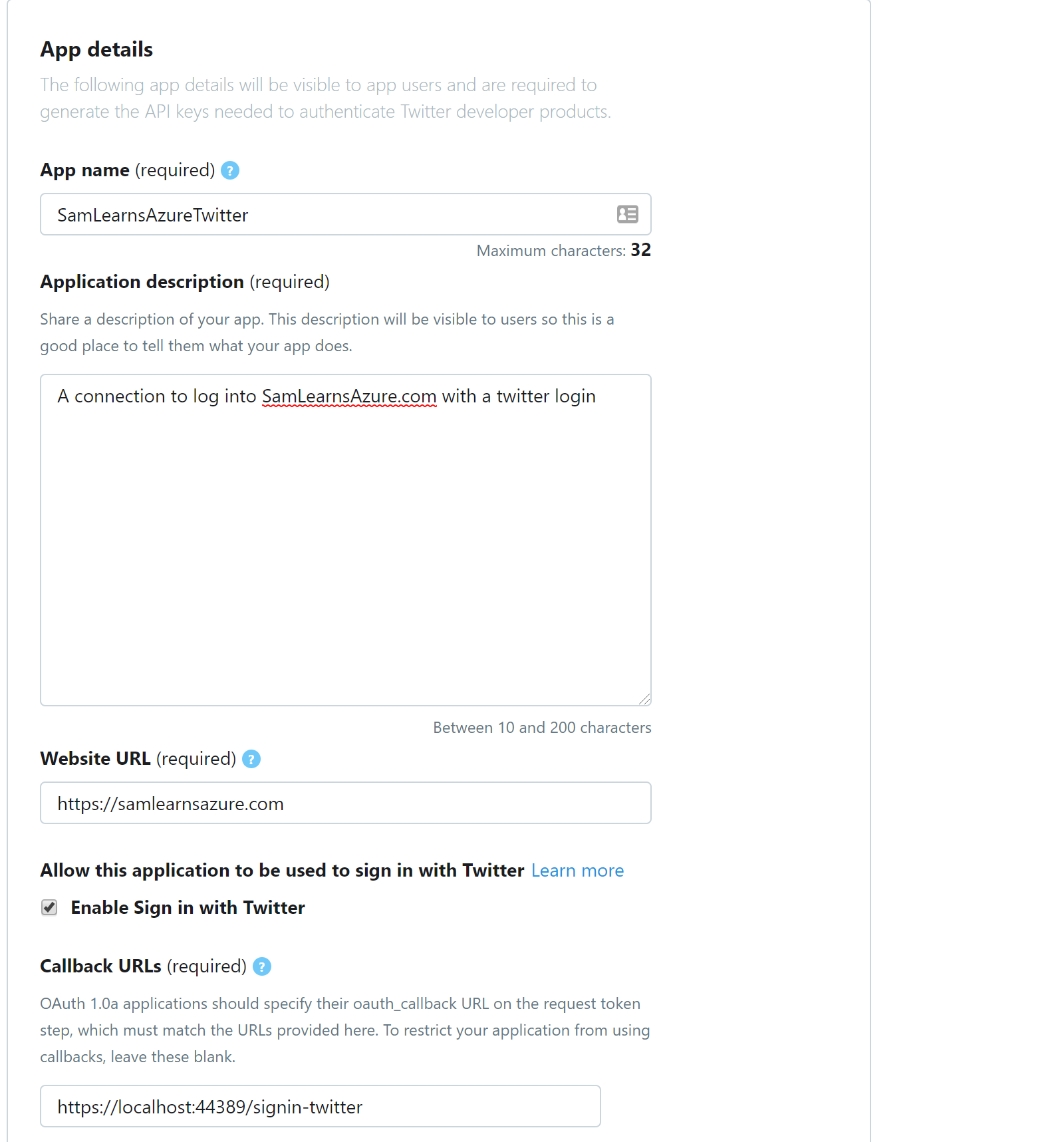 With our developer account created and approved, we create a Twitter app, naming it “SamLearnsAzureTwitter”, and add a description, website URL, and callback URLs. As with the Microsoft callback URLS, we add URL’s for our local development server and the three DNS’s we have, appending “signin-twitter” to the end of each URL.
