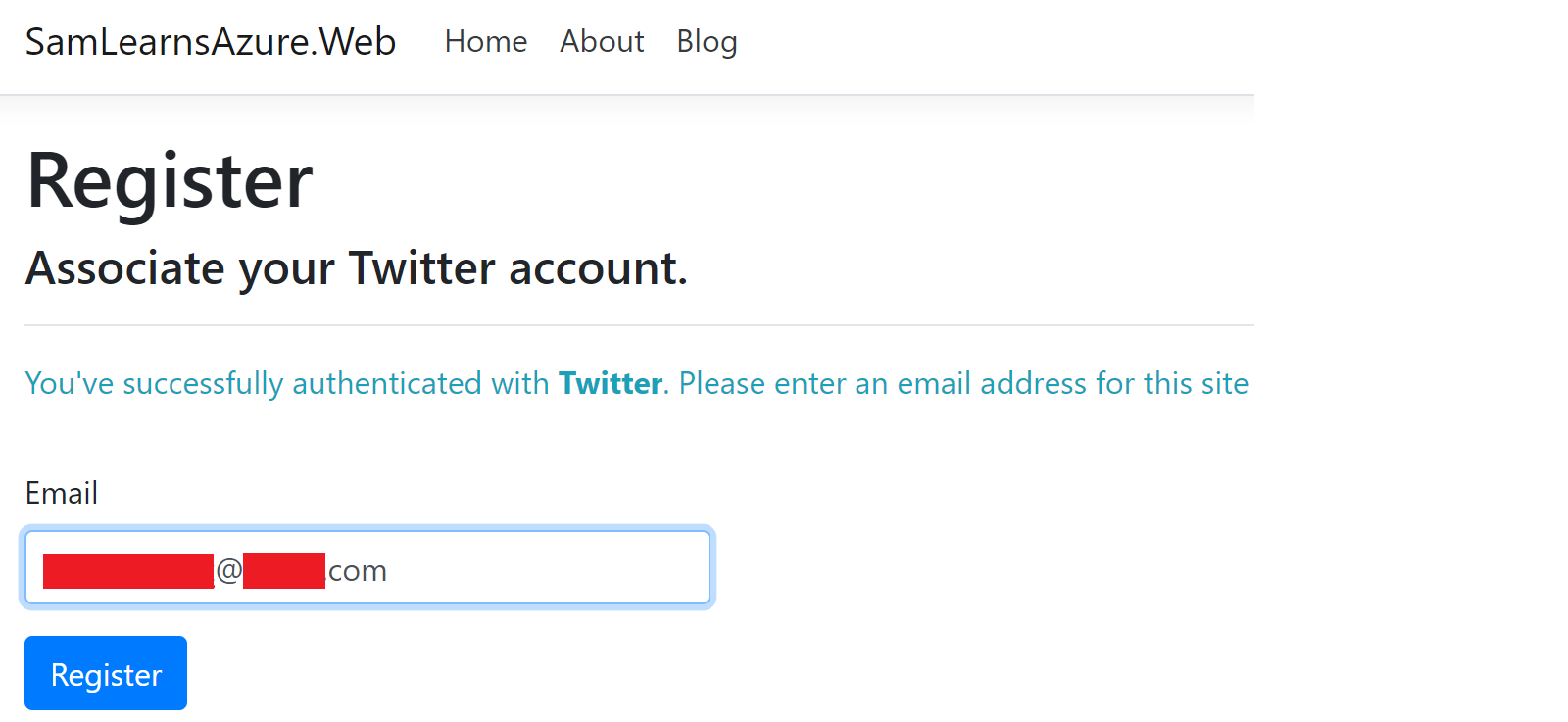 As a final step for Twitter, our app asks us to register our Twitter account with an email address, which associates the login with our website. We have successfully added Twitter authentication to our website.