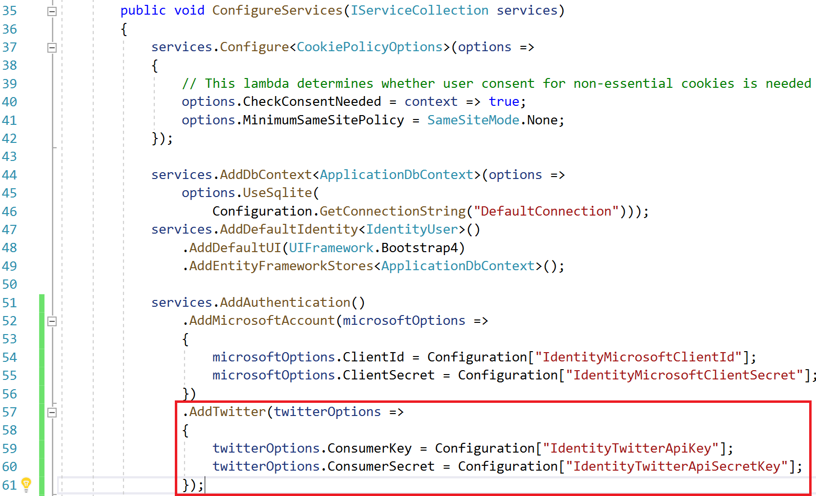 Back in our website startup.cs file, we add the lines we need to add Twitter to our application and read in the secrets we added from our key vault.