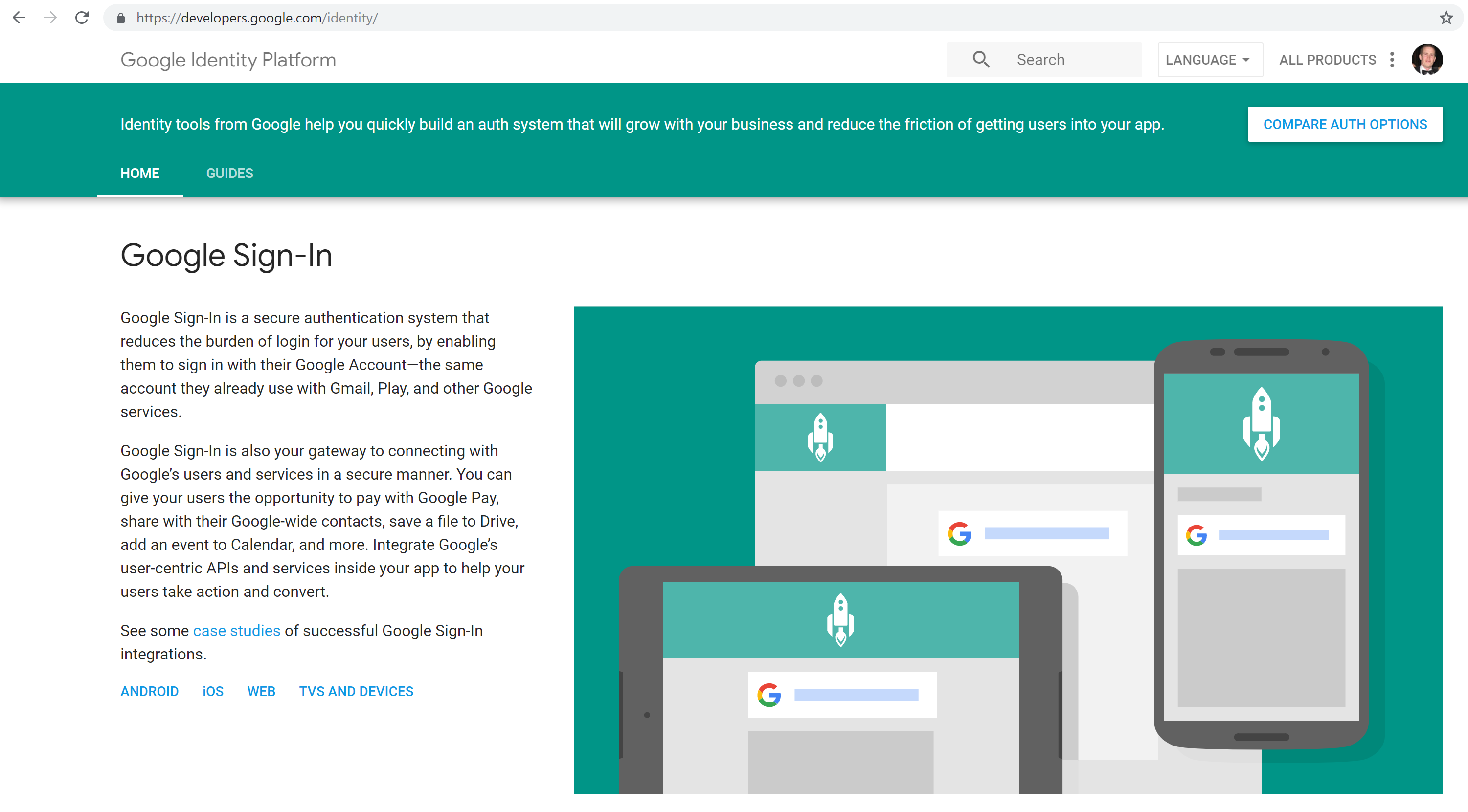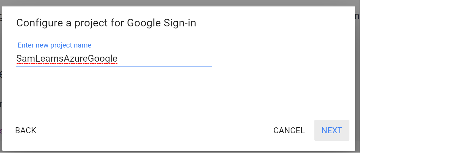 Moving on with Google, we browse to https://developers.google.com/identity and create a new project