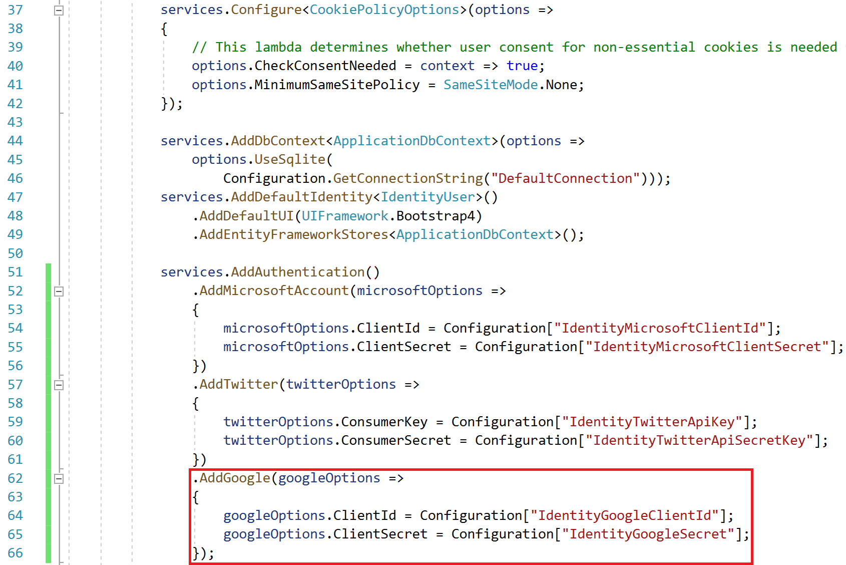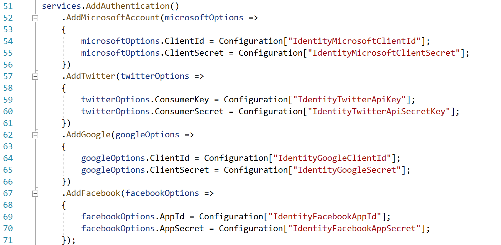 As we bring it all together, our completed startup.cs file is shown below. Note that each of the external connections is built off the parent “services.AddAuthentication” on line 51 – it is not repeated for each external connection. This is in line with the recommended implementation.