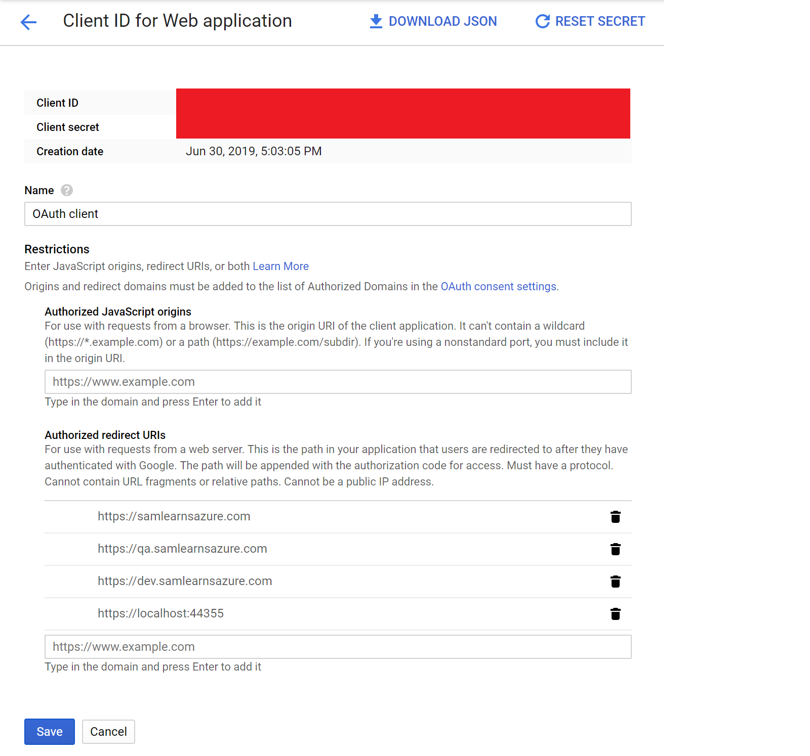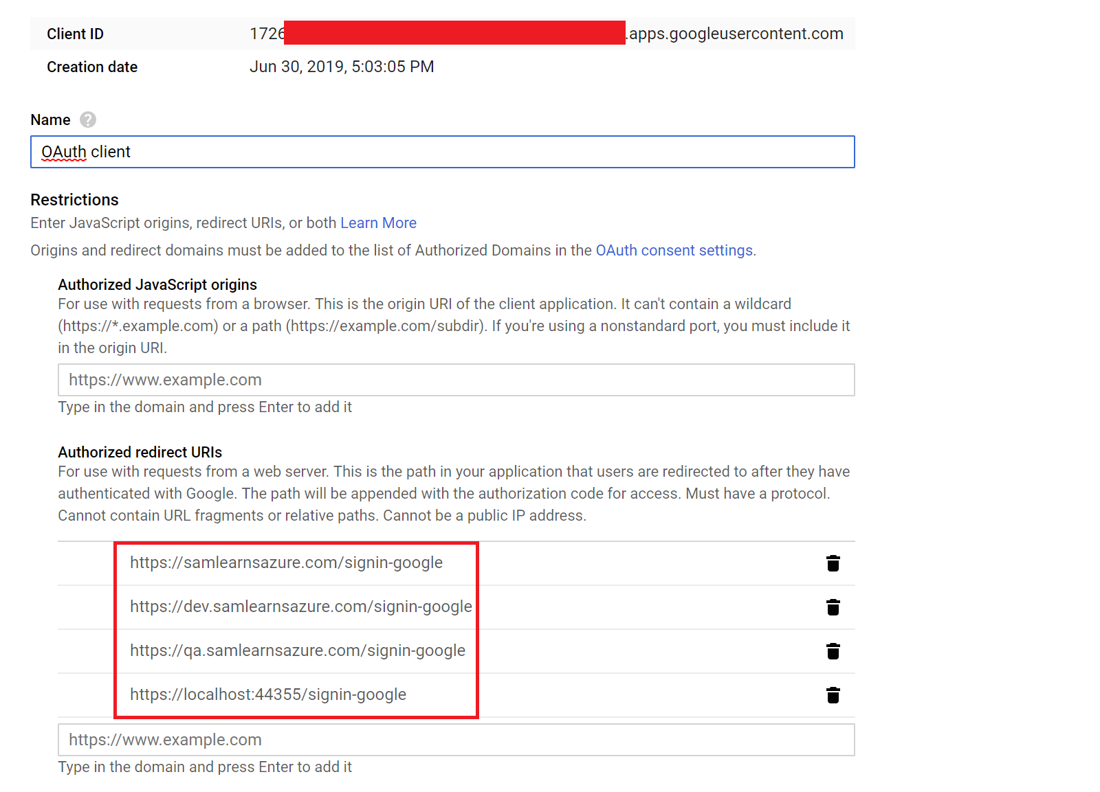 In the OAuth section, we add in our redirect URLs for our 3 sites and internal local host, appending the “signin-google” suffix to each URL.