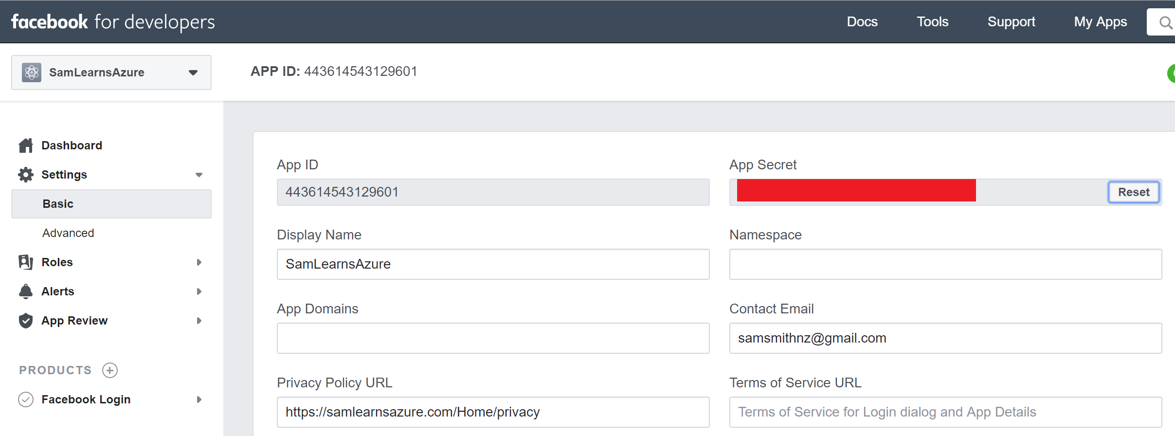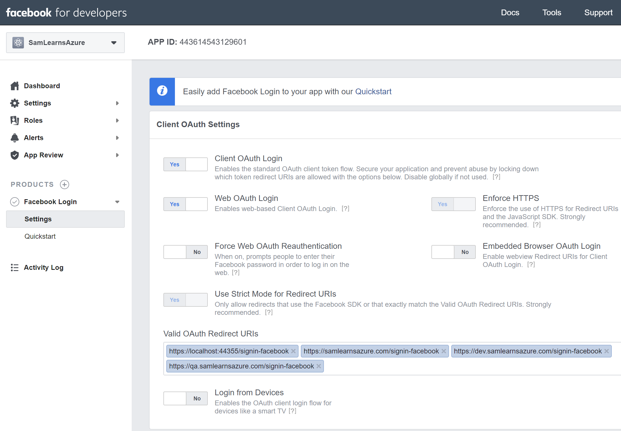 Finally, in Facebook, we log into https://developers.facebook.com/apps, and create our final app, “SamLearnsAzureFB”. We put in the redirect URL’s,appending the suffix “signin-facebook” to each URL.