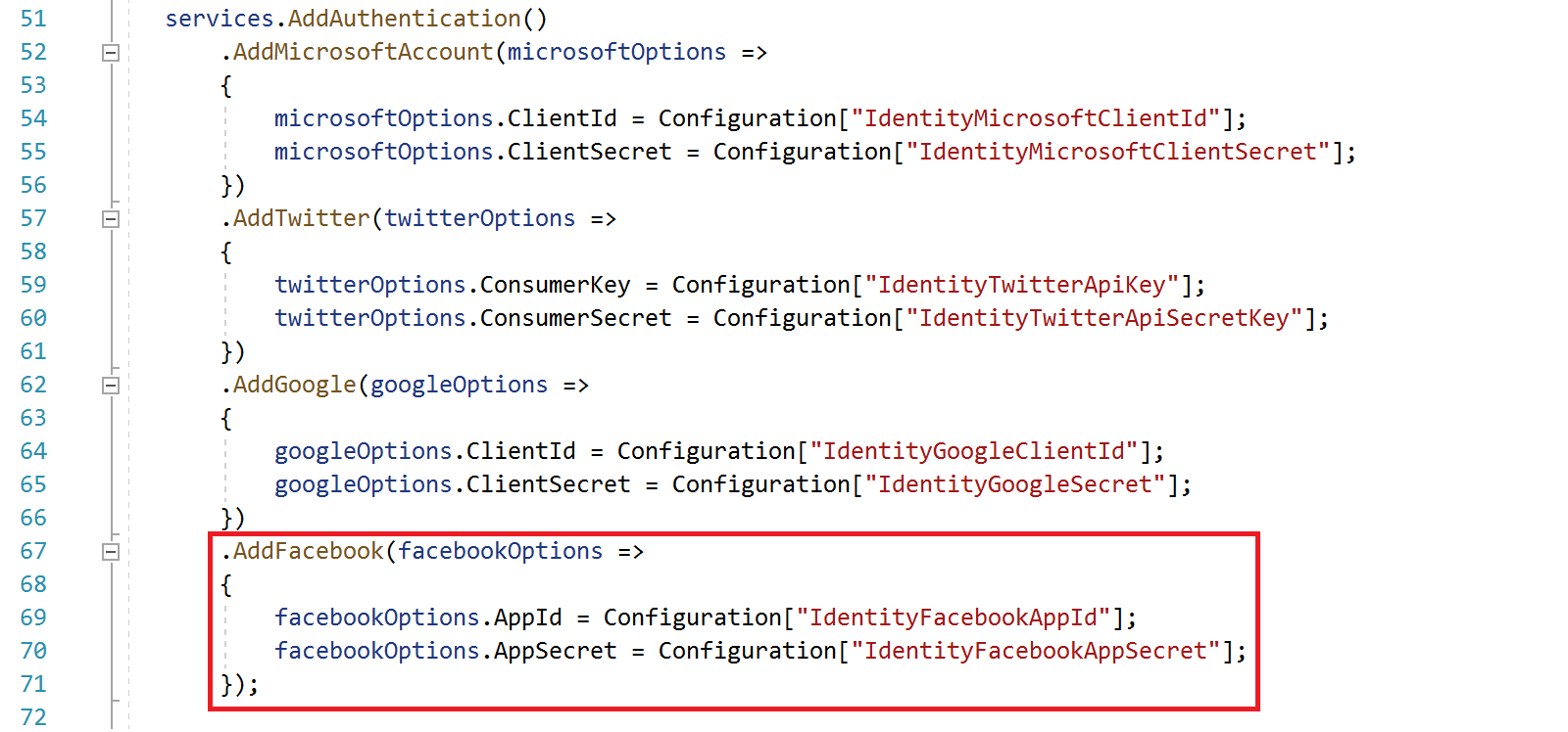 In our startup.cs, we add our Facebook authentication code, reading in our key vault app id and secret for Facebook.