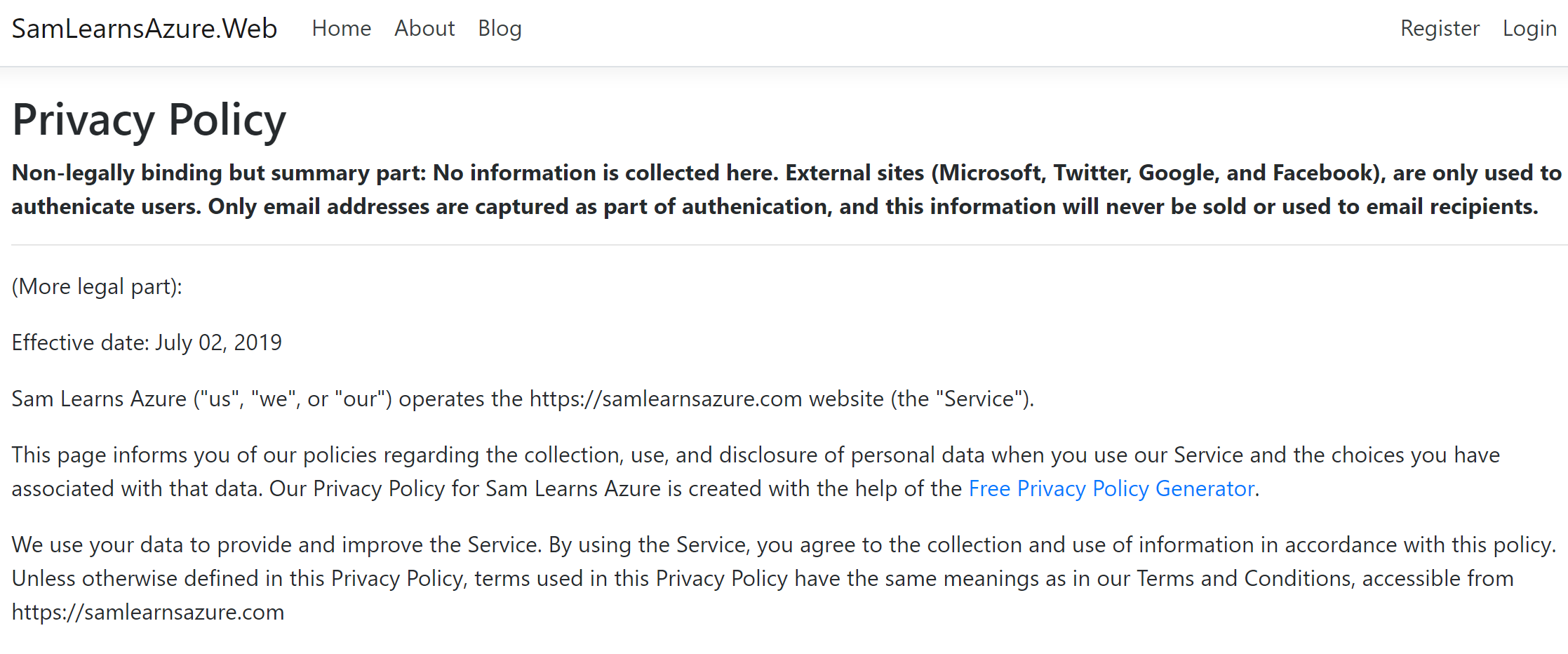 As we signed up for each of these external authentication services, many of them required a privacy page URL. Unfortunately, our privacy page was still the ASP.NET Core default, we needed to add content, quickly. Fortunately there are existing websites and services that can assist us in generating the this text. We have created our own, this is by no means is this a recommended legal page, but sums up our policies pretty well.