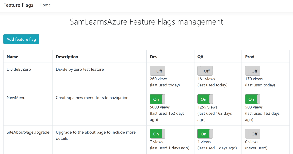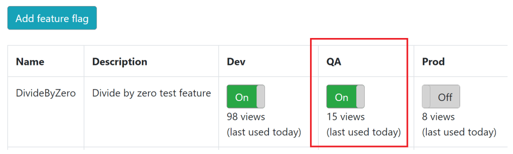 - We will also track the number of hits each feature flag will receive and the last date the feature flag was used. This will help us to track feature flags that become stale and can be removed, assisting with tracking technical debt
