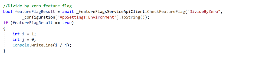 Finally, we update our website to call the feature flag service. As ab example, supposed we write this code below to divide a variable by zero, and wrap this in a “DivideByZero” feature flag. If the flag is enabled, then we divide by zero, creating a critical error. If the flag is off, we don’t run this code. Fun fact: The compiler is surprisingly good at not letting you divide by zero, you need to assign the numbers to variables.