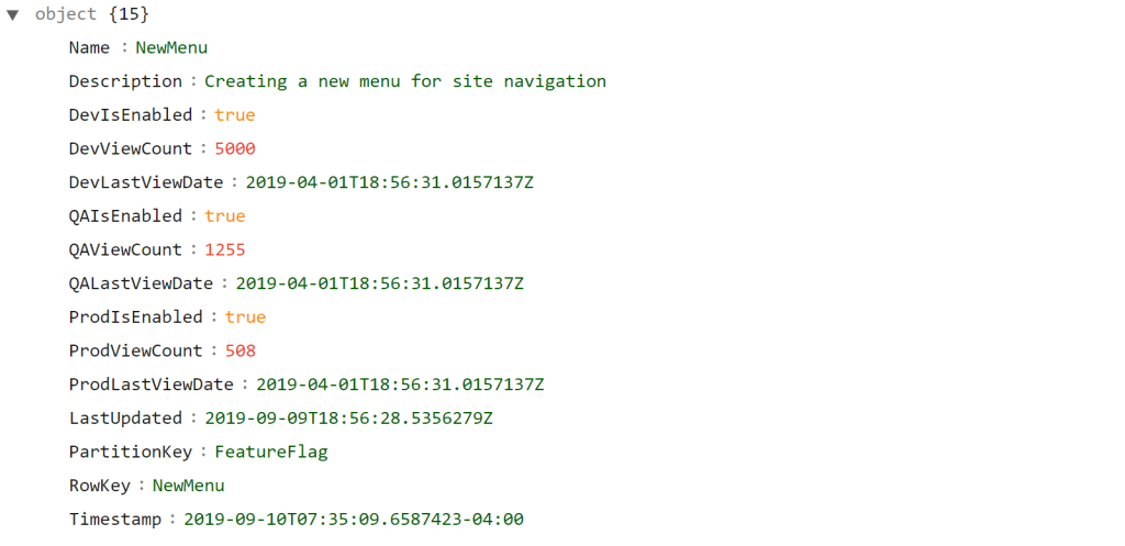 The web service is relatively simple. It has a few functions in the controller to get all feature flags, get individual feature flag details, update flags, and delete flags, and check the status of a feature flag for a particular environment, all stored as JSON documents in our Azure Storage table account. Here is an example of the JSON document for the “NewMenu” feature: