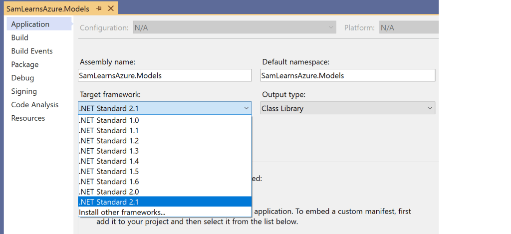 Note that as our models project was using .NET Standard 2.0, we will upgrade this to .NET Standard 2.1.