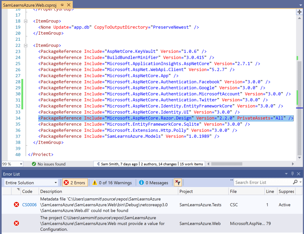 While in the project file, we need make a few more edits to the packages, as some of the items don’t have a version, or reference .NET Core 2.2. We start by removing the “Microsoft.AspNetCore.App” package on line 27, which has no version. We also remove the Razor package on line 34, which we can see in the screenshot, did not upgrade from .Net 2.2, and is not required in .NET 3. All of the other versions look right, but this is a good upgrade item to ensure you follow.