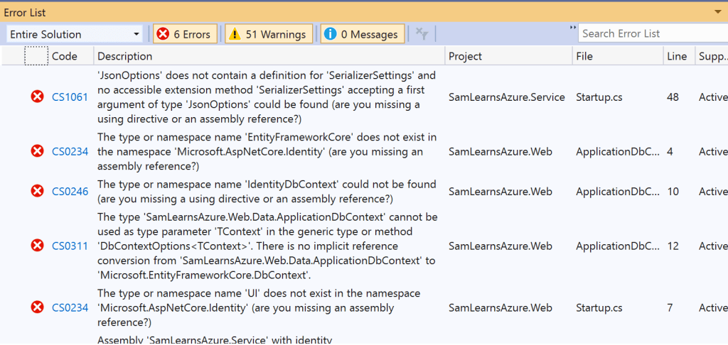 Our solution now has 6 errors and 51 warnings. There are a number of known breaking changes in .Net Core 3 we need to be aware of, and will upgrade the projects one by one, starting with the website, then web service, and finishing with whatever is left, starting with the errors first.