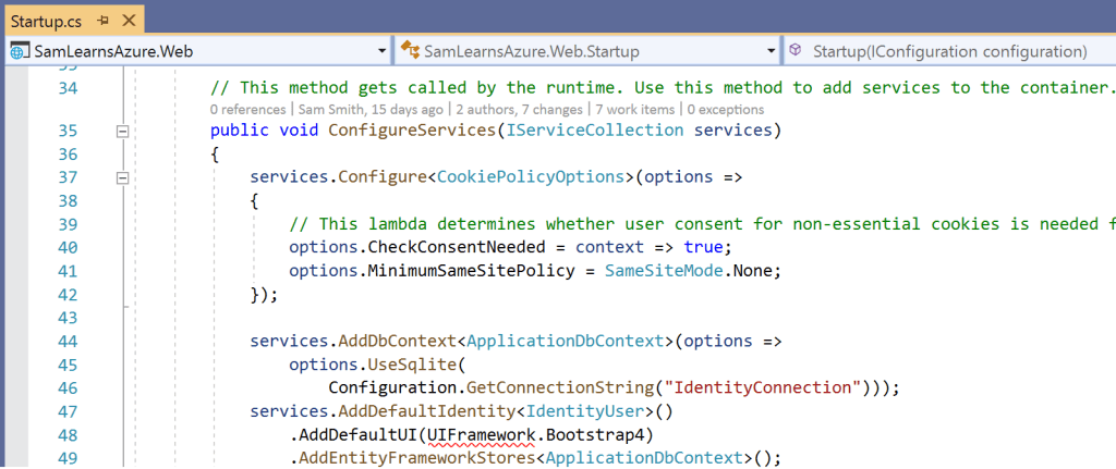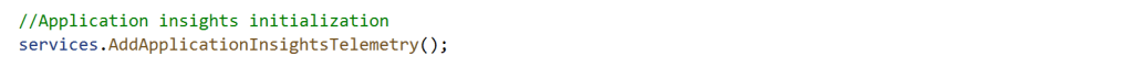 Then in the ConfigureServices function, in startup.cs, we add the following text: “services.AddApplicationInsightsTelemetry();”.
