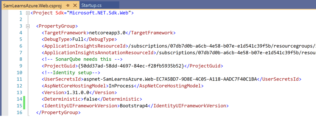 Next, in our project file, we add “<IdentityUIFrameworkVersion>Bootstrap4</IdentityUIFrameworkVersion>” to line 15.