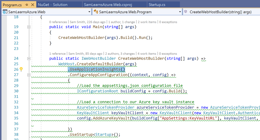 Next, we are going to resolve the Application Insights warning. The first step is to remove the “UseApplicationInsights()” code from line 26 from our program.cs file: