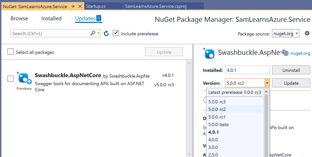 Swagger is in a complicated spot as of publishing. They haven’t quite been able to release a full version of a .NET 3.0 supported package for “Swashbuckle.AspNetCore”, but they do have some release candidates that work. (Note that the naming here is confusing, Swashbuckle is essentially Swagger). This is where things get sticky. We found that rc3 did not work, but rc2 did. More information about this here in GitHub, but our current recommendation is to NOT use rc3 at this time.