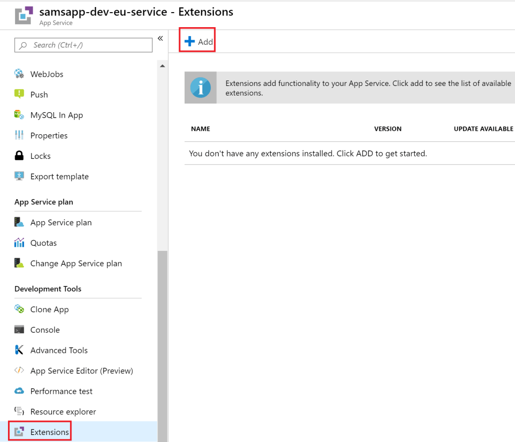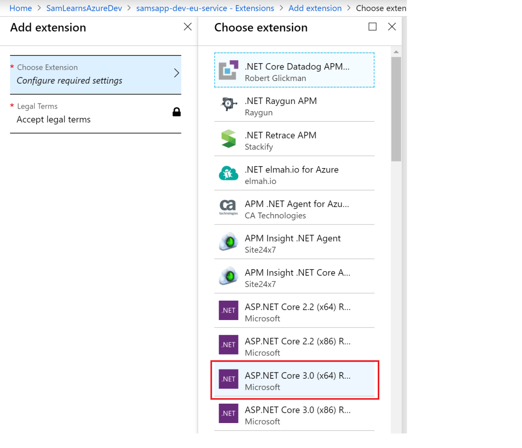 Finally, as of publishing, Azure web apps still don’t support .Net Core 3.0, but there are three workarounds. Today, we are going to install the extension as a short term work around. We start by opening our web apps in the Azure Portal, and opening the “Extensions”.