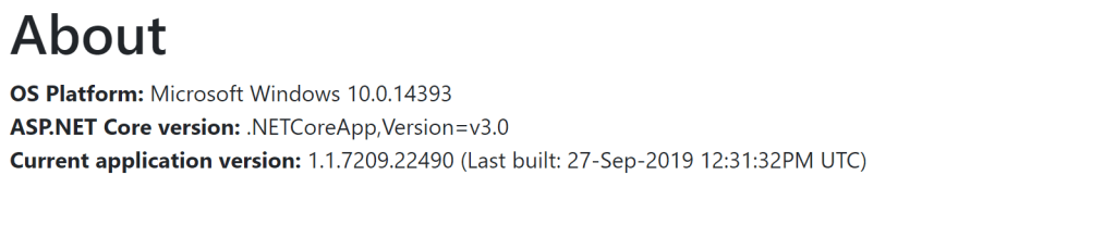 We run our DevOps pipelines to build and release our application. As we added version information to our website last week, it was easy to verify that the application is running .Net Core 3.0.
