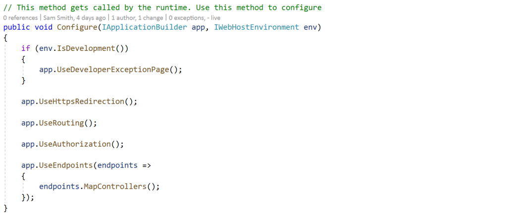 This is a very straight forward fix. We just replace with the “services.AddControllers” function. While the “AddMvc” function configured everything that MVC needed, in a Web API, things like views are not required and can be stripped back. “AddControllers()” is specifically for Web API’s, in that only what is needed for a Web API is initialized when it’s called.
