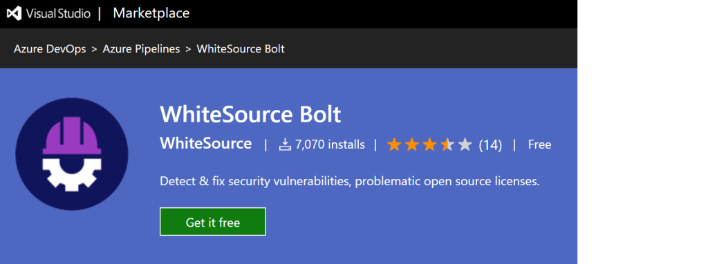 First, we need to browse to Azure DevOps marketplace, and find the “WhiteSource Bolt” task. You will need to be an Azure DevOps administrator to add this task to your Azure DevOps instance.