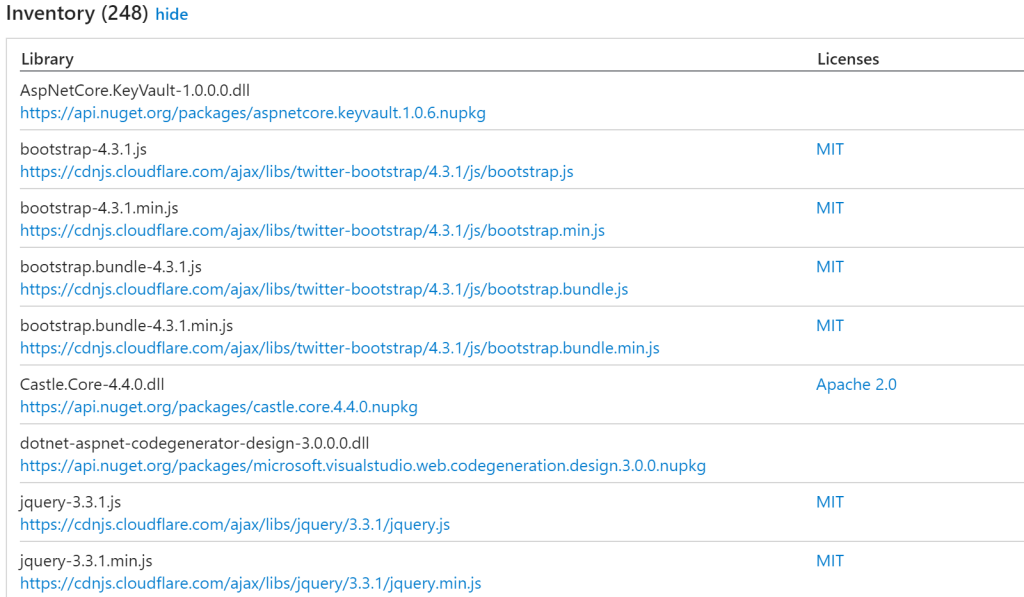 Finally, we are shown an inventory of all libraries found and the associated license – if known. This is useful to understand exactly what WhiteSource Bolt found in source control – sometimes you’ll find a library you thought had been removed or a library you didn’t know was still in the source control.