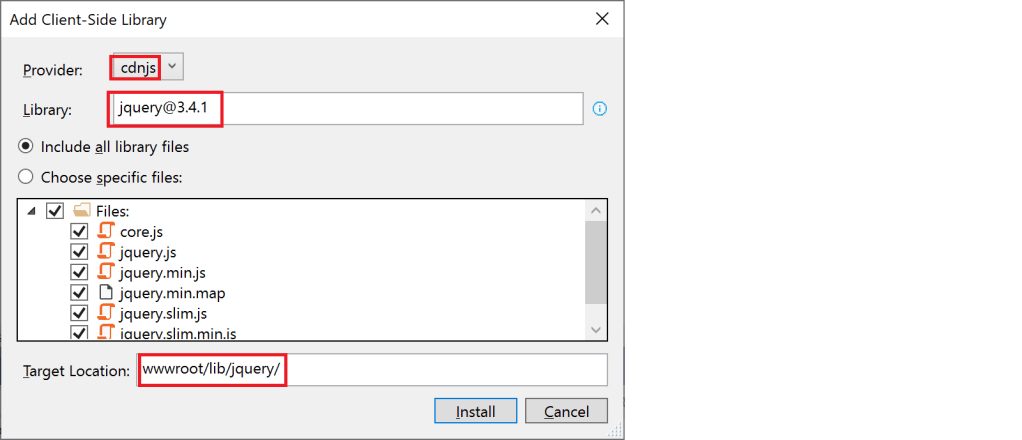 In the popup that appears, we start to search for “JQuery”, selecting the version 3.4.1, ensuring the target location is correct, and pressing the install button.