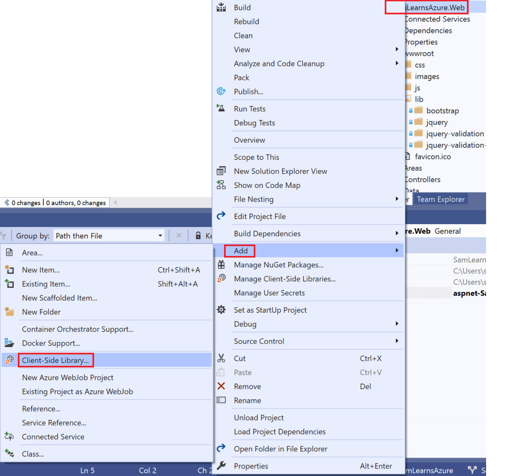 To fix the JQuery libraries, we have to upgrade the client side libraries. As we created this Website using the ASP.NET CORE 2.2 template, it doesn’t seem to have an easy way to upgrade. To solve this, we are going to use the Client Side Library feature to replace the existing files. Right clicking on our website, we click “Add” in the menu, and then “Client-Side Library”