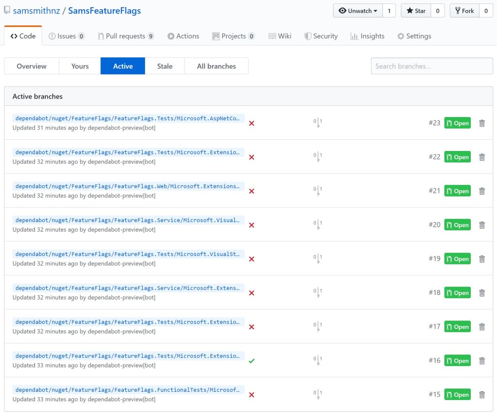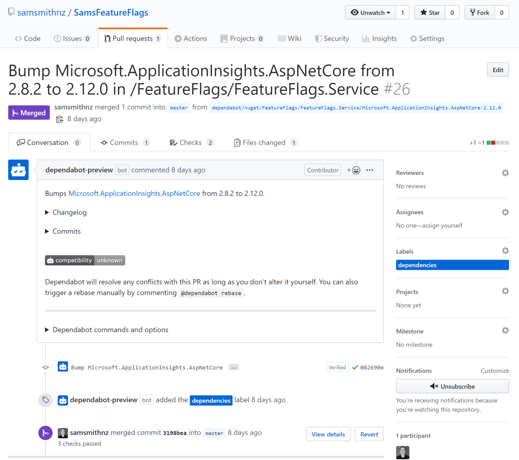 Now DependaBot is setup for our project, we can manually ‘bump’ DependaBot to run. Alternatively, we could have waited for it to run it’s daily scan – as we have DependaBot checking the Feature Flags project to at 6am every morning. When it runs, if a dependency update is found, a new Pull Request is created with the upgraded dependency and an email notification is sent. Below is an example showing an update to the Application Insights dependency. All we need to do is review the Pull Request, ensure all of the tests passed successfully, and we can confidently approve and merge this update.