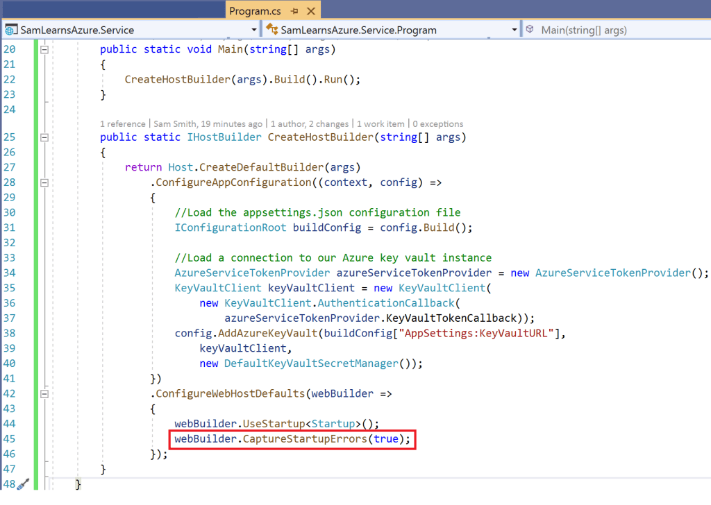 So how do we report these errors better in the future? As it turns out, startup error handling is purposely disabled. To show these errors, we need to add “CaptureStartUpErrors(true)” to our program.cs.
