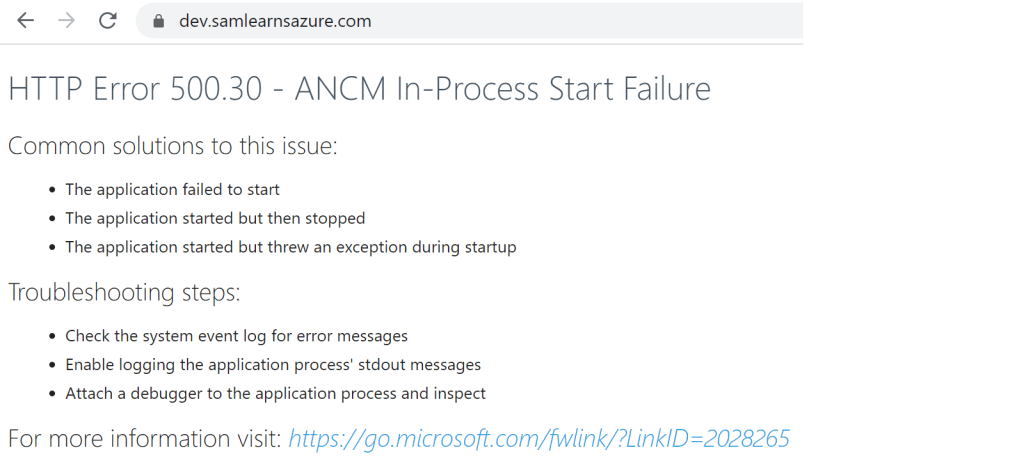 Let’s look at the most recent example, “HTTP Error 500.30 – ANCM In-Process Start Failure”. As you can see from the error below, there are no details, apart from statements that your application could not start – but we already know that, it’s why we are looking at an error message instead of the front page of our application.