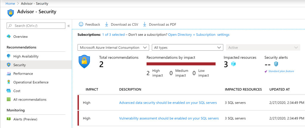 We’ve done a decent job resolving these recommendations in the past, but in our Azure portal today, we have two outstanding SQL security recommendations. Resolving these would cost $15 per server. With our three environments, that is an additional cost of $90 a month. We unfortunately have budgets, and therefore have made the decision to accept the risk of these items and disable the recommendations. Here is our current view of the two recommendations in the Security Advisor.