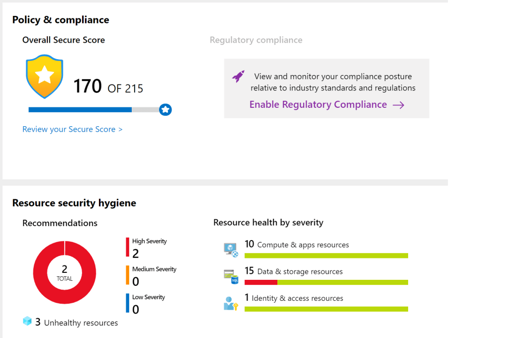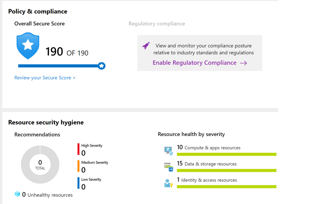 Removing these two recommendations has reduced the total possible score to 190, and resolved all outstanding recommendations. We are now at a level playing field. With alerts to ensure we don’t reduce our compliance level, we will be alerted anytime a new recommendation is created, or a resource is added that is out of compliance.