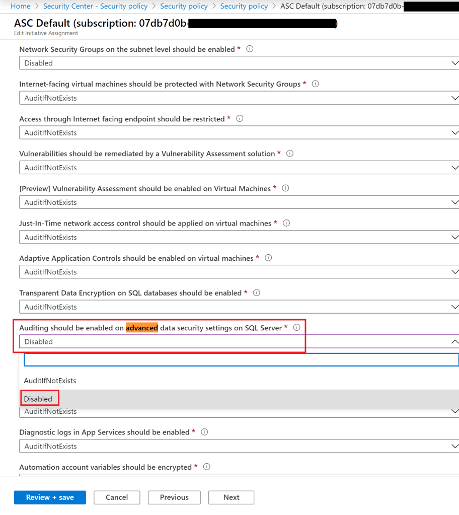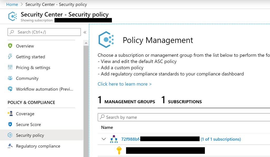 Fortunately there is a process to disable recommendations we don’t need. First, we open security center, and select the subscription or management group we want to add the policy exceptions too.