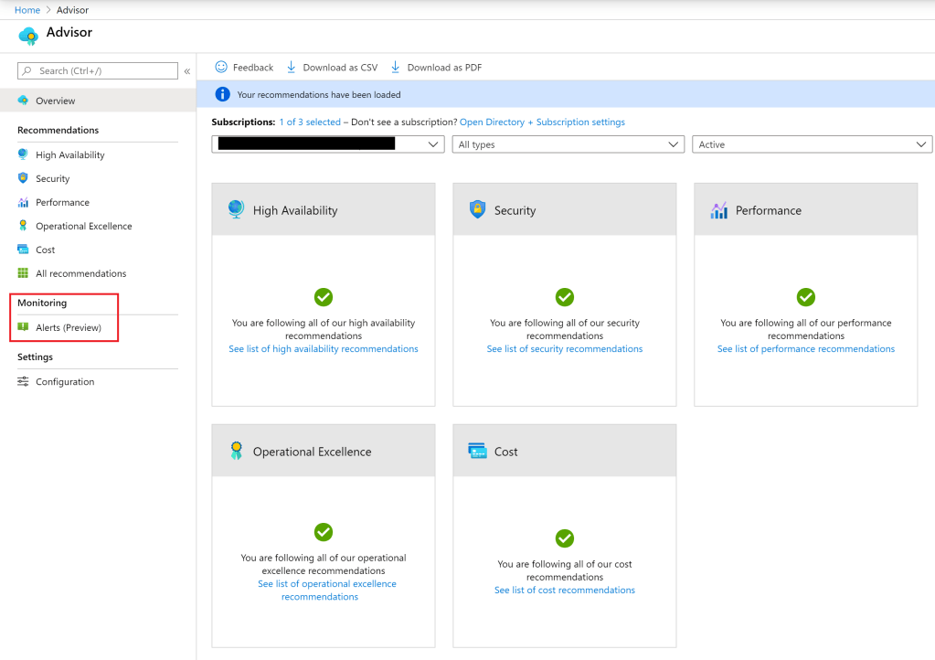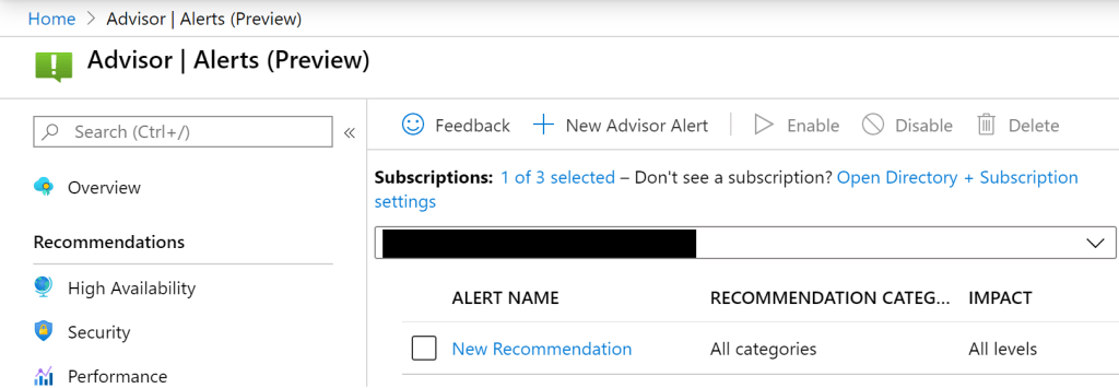 How do we stay on top of these recommendations moving forward? Let’s create an alert when new recommendations are triggered. Yesterday we were playing with some bots and it triggered a new security alert we didn’t see until today. Wouldn’t it be better to know as soon as a new recommendation is created or we create a resource out of compliance? Fortunately in Advisor there is an “Alerts (preview)” feature.