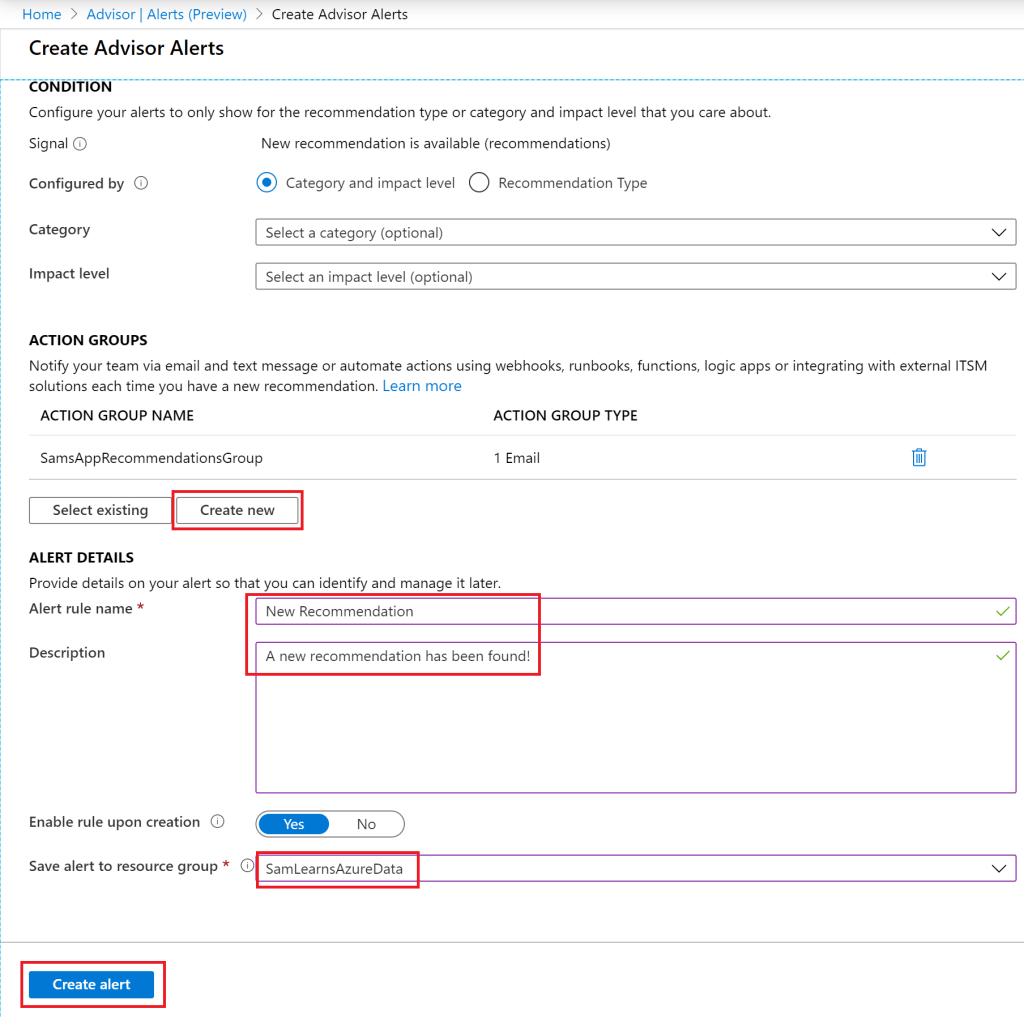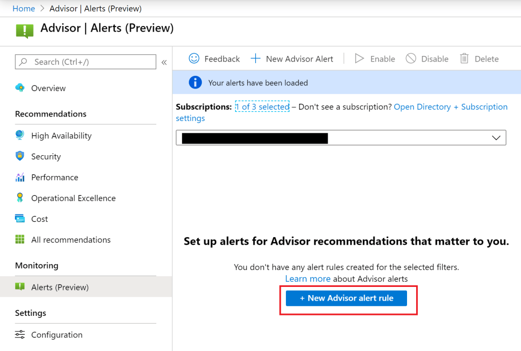 With the alert saved, we can see it in a list. Next time we add a resource that creates a recommendation, we will be notified!