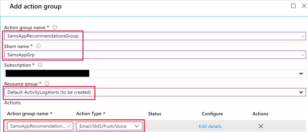 To create an action group, we need a name, a short name (< 12 characters), a resource group, and action name. In the action, we also specify who will receive the alert, where we specify our email address.