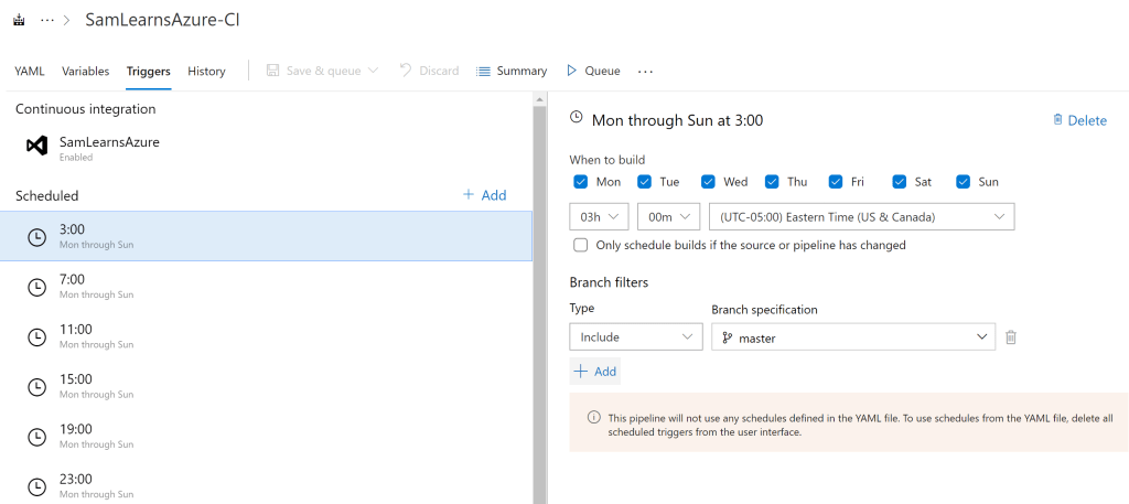 The second schedule option is to use the triggers section in the Azure Pipelines UI. This is easier to understand, but clunky to maintain. This option is available even for YAML pipelines, but note that these triggers will override any CRON schedules set in the YAML. We used this as a testing ground, with the plan to delete and move the logic into the YAML after testing is complete. The example below sets up a schedule running every four hours starting at 3am.
