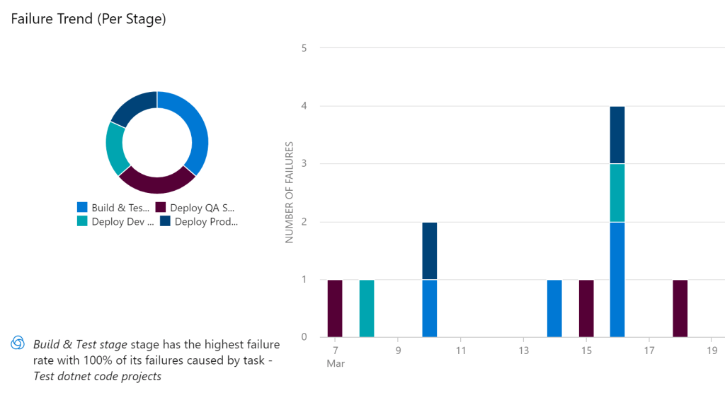 Our pipeline pass rate was now running at around 88%, but we were receiving what appeared to be fairly random errors. At this stage, we decided to amp up the feedback, and increase the pipeline frequency to run the build every two hours, (starting at 1am to avoid the 2am database restore). With the pipeline now running 12 times a day, we also start to use the analytics section of our build to see pipeline failure trends. Let’s look at the last “14 days” view first, after two weeks.