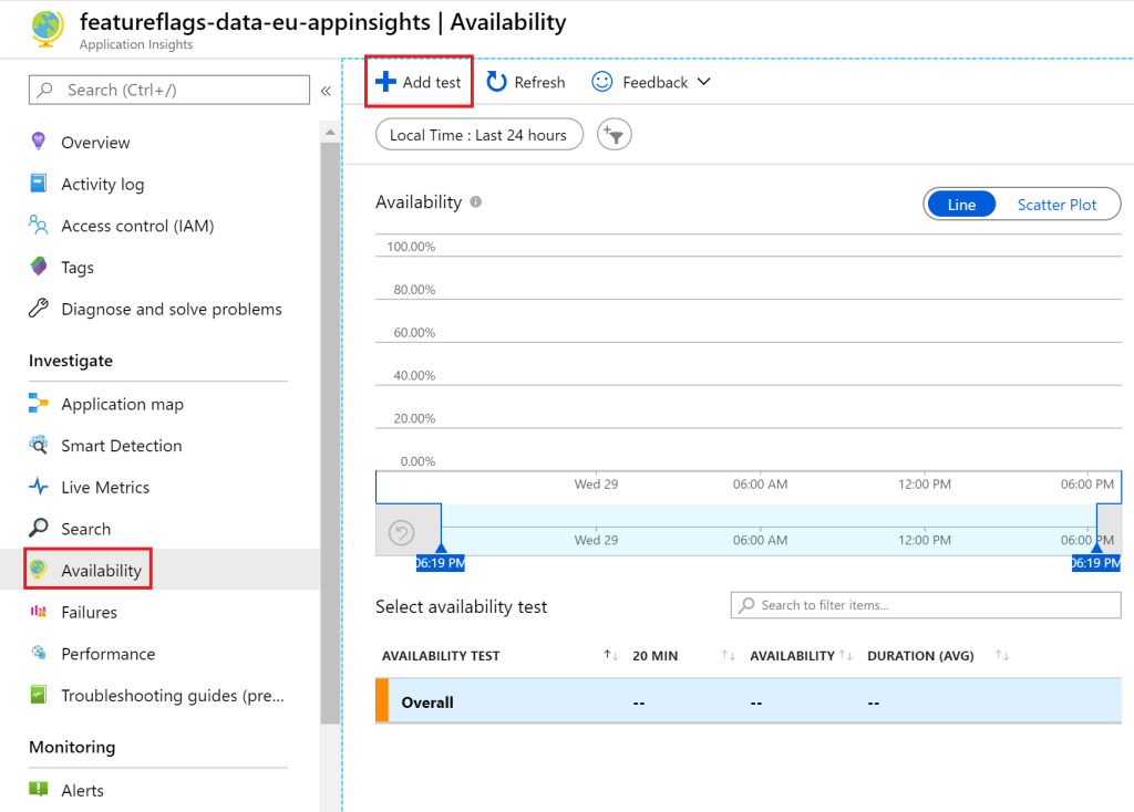Creating the availability test is a quick process. First we open up the Application Insights instance we are going to add the test too, and open the “availability” section. Then we click on “Add test” to create a new test.