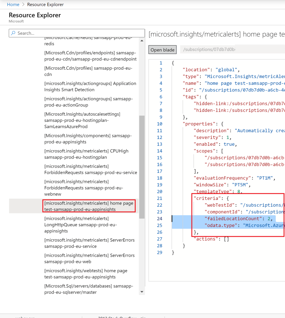 First, we export the alert we created manually in the last step. This gives us the base JSON document that we add into our ARM template. We replace the parameters with our own variables, and immediately note that the criteria is blank. We’ve seen this before, this is a known issue with the Azure Portal export. Last time we ran the AZ CLI code to see the criteria, but for whatever reason, this doesn’t work this time. Fortunately the resource explorer can help us! Opening the resource explorer, we browse to the resource group, select the alert, and we can see the criteria we need! We paste it into the criteria section of the ARM template.